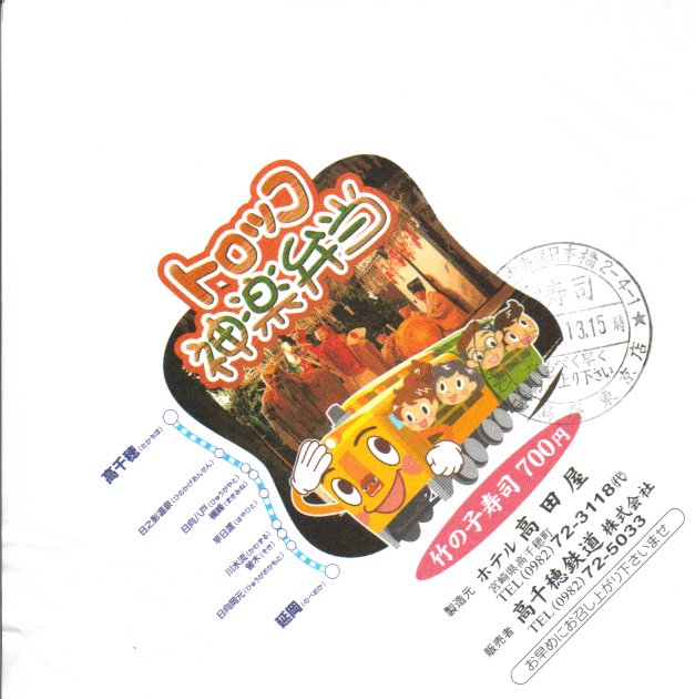 2003(平成15)年3月に登場の高千穂鉄道トロッコ列車を記念し、同年10月1日に発売したと思われる、高千穂鉄道史上初の駅弁。但し乗車3日前までに弁当を注文したトロッコ列車の利用者にのみ発売されるそうで、実態は駅弁ではなく車内弁当。同年9月10〜16日の日本橋高島屋の宮崎物産展で先行販売された