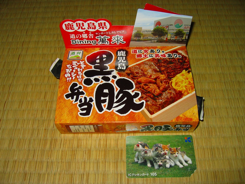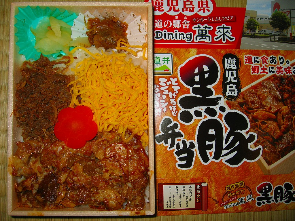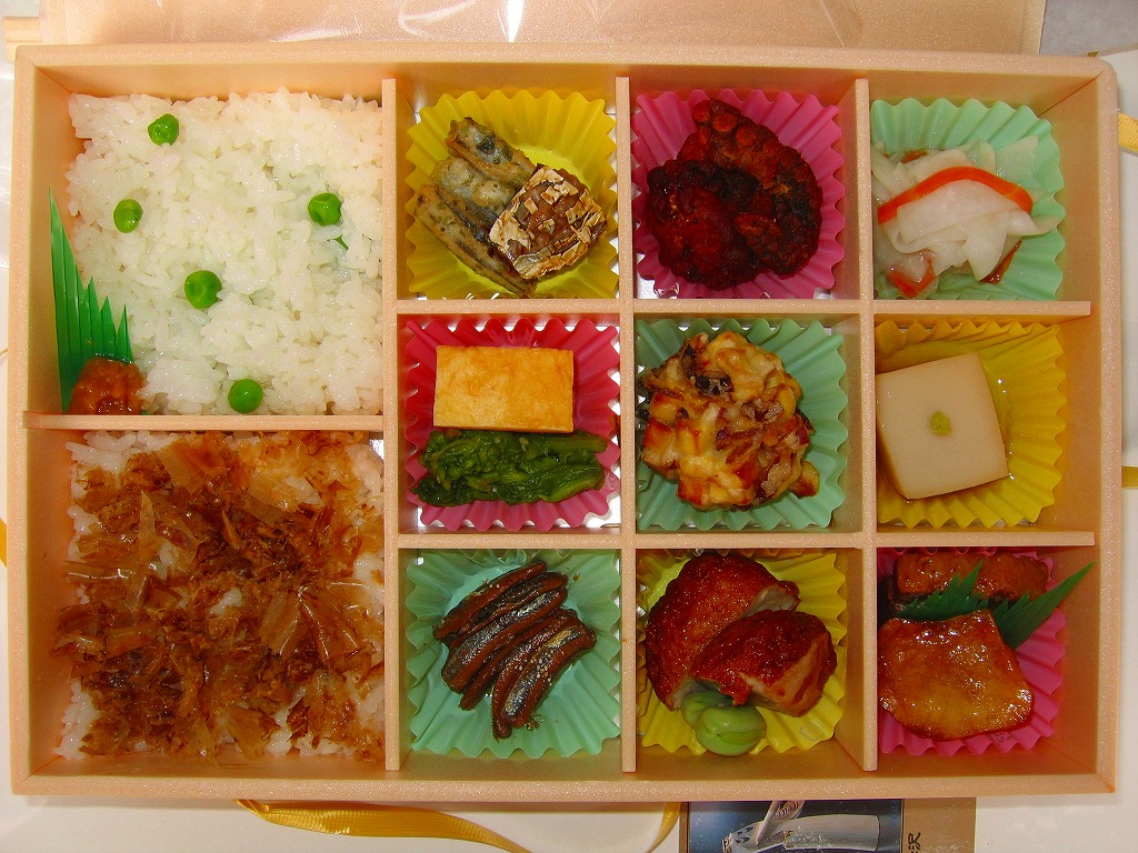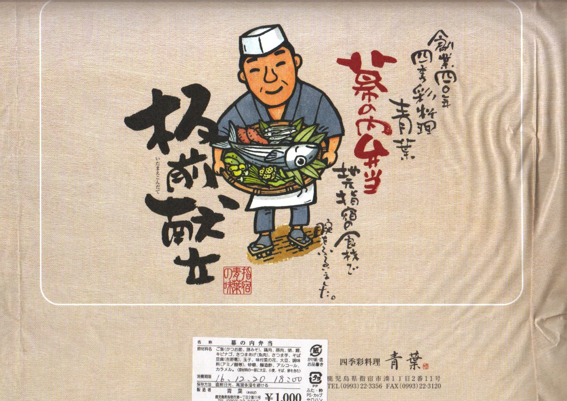 大きいが強度のない容器に、板前さんのイラストを載せたもっと大きく薄手の掛紙をかけて、ビニールひもでしばる。中身はグリーンピース御飯とおかかごはん、それに黒豚角煮やカツオ腹皮の木の芽焼やきびなごなどが入るというが、それぞれが小粒少量で風味を感じ取れないことに加えて、解説やお品書きがないので予備知識がないと指宿や鹿児島との関連が分からず、だいぶ損をしている。また、水分を逃がさない容器により水気が風味を落としている感じもした。