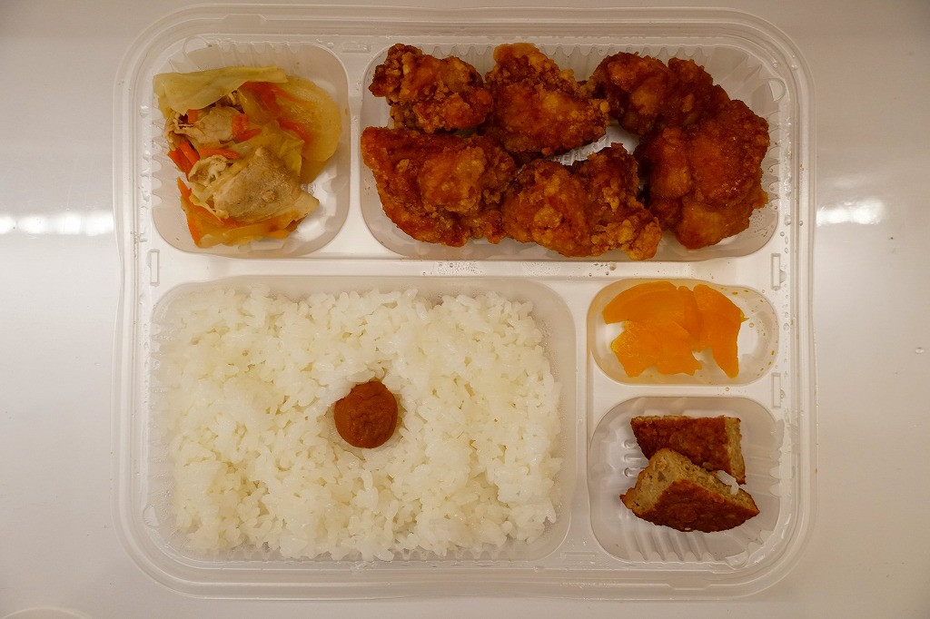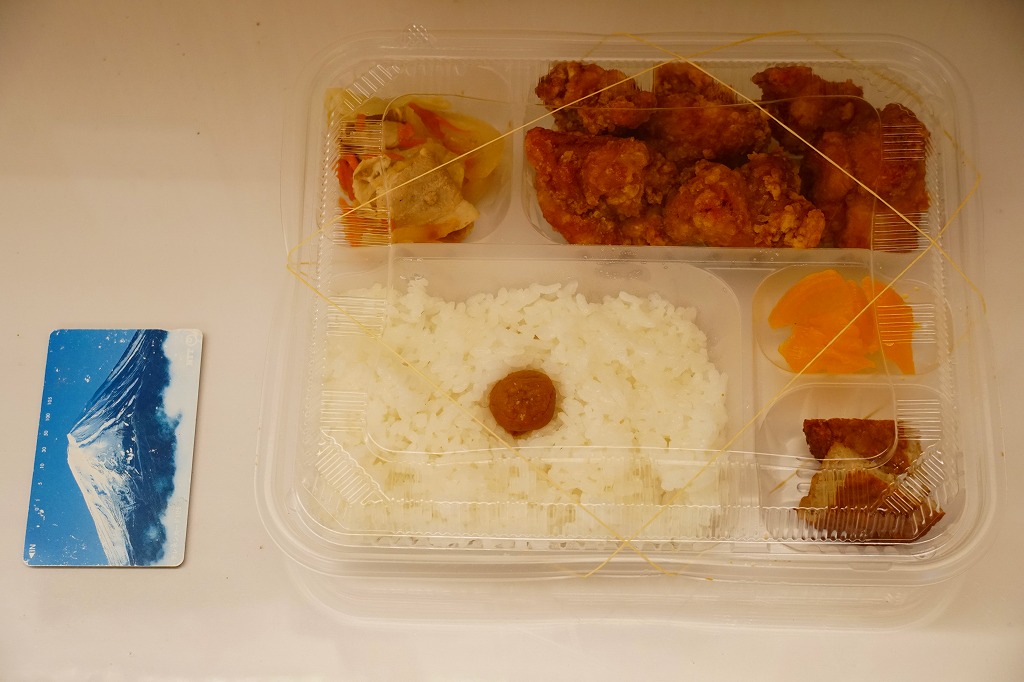 これは駅弁でなく、2025年1月に鹿児島港から三島村の各島へ行くフェリー「フェリーみしま」の乗船時に、乗り場に来た弁当販売車で買えた弁当。その販売は船内で放送され、買い物客の行列ができ、船が出港する前にいなくなった。これは日の丸御飯に鶏唐揚、豚肉と野菜炒め、ハンバーグ、たくあんを添えた、とりから弁当。鹿児島や三島その他の郷土や地域性を持たない惣菜弁当だと思うが、おいしかった。味噌汁付きで600円均一。