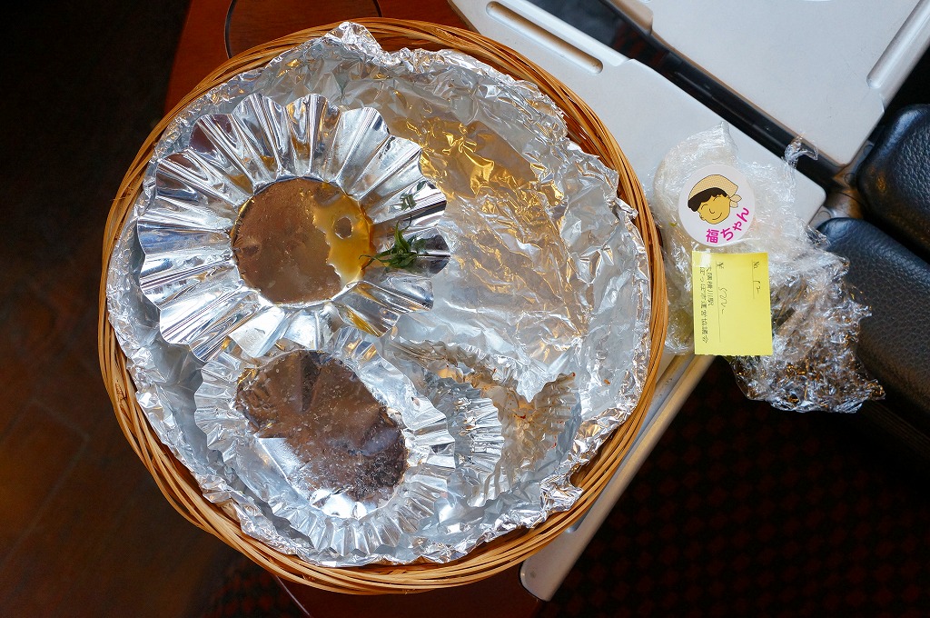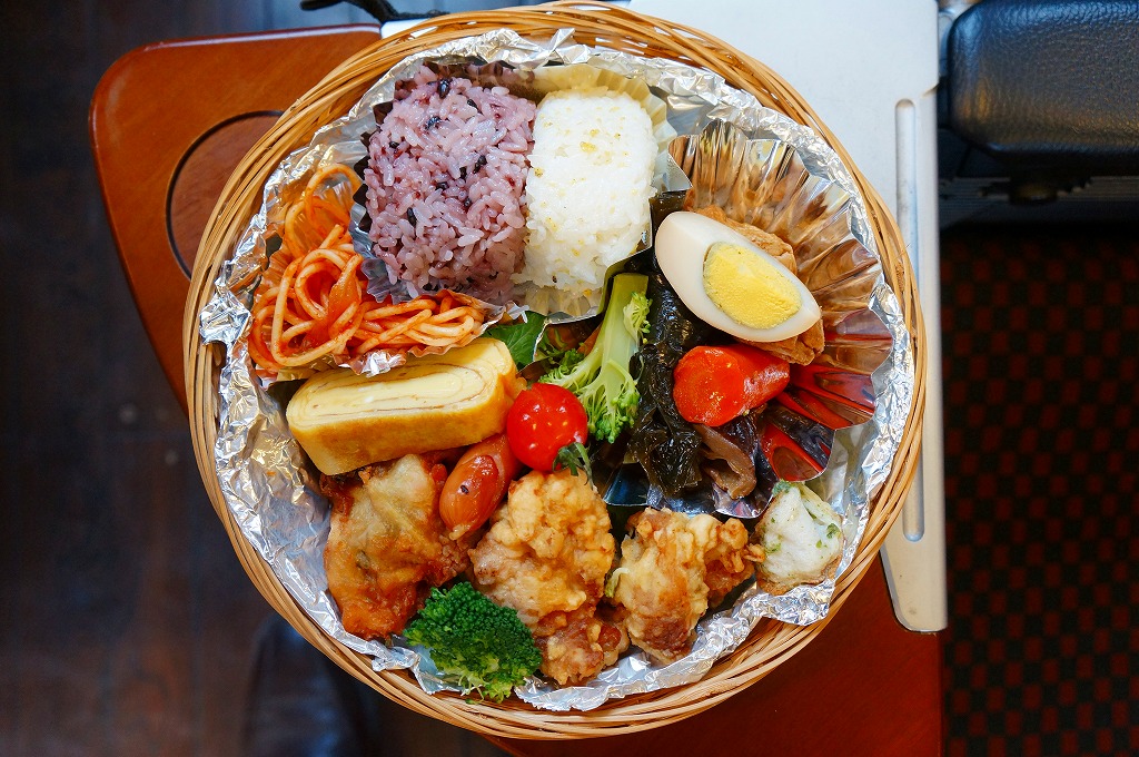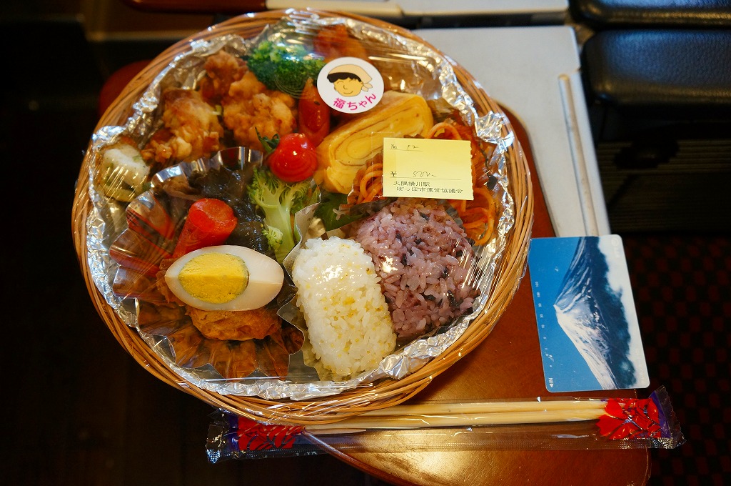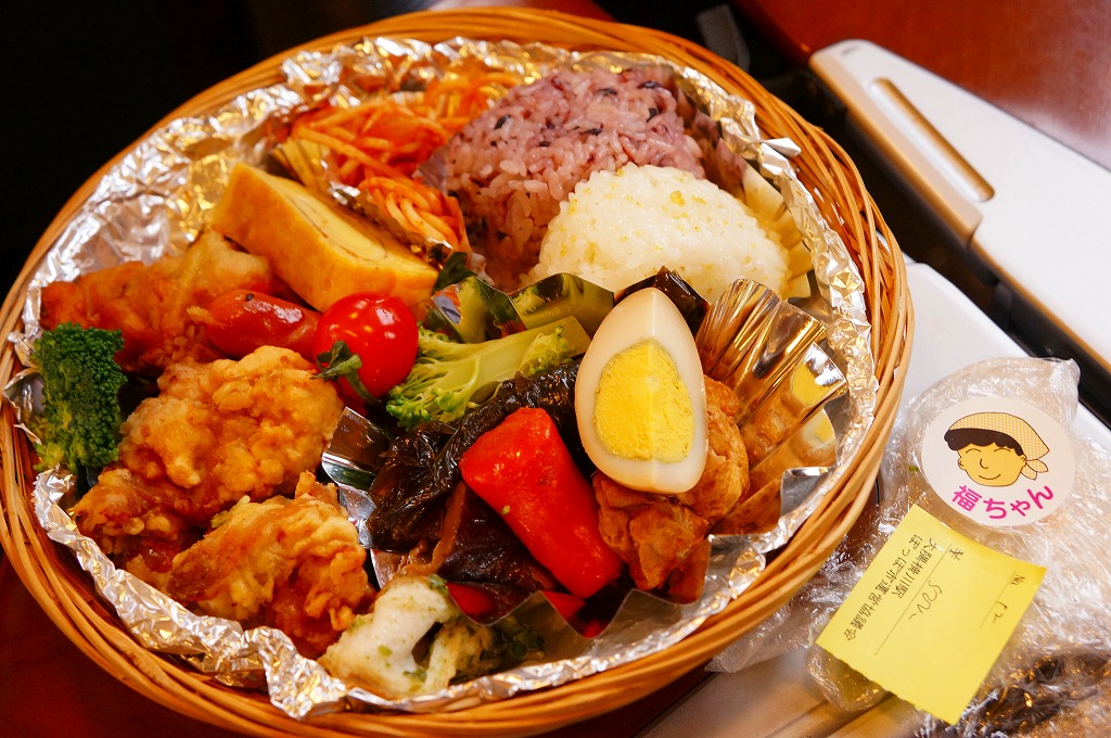 観光特急「はやとの風」で訪れた大隅横川駅で、様々な物品とともに販売されていたお弁当。浅い竹籠にアルミホイルを敷き、きび入りおにぎり、黒米入りおにぎり、玉子焼、スパゲティ、鶏唐揚2個、ガネ1個、ナスなどの煮物、ウインナーなどを置き、ラップで包んでいた。たった500円で、これは賑やかな1人用オードブル。駅弁の視点では、京都駅の竹籠弁当を薩摩風にアレンジしたような感じ。大隅横川駅待合室での物産販売「ぽっぽ市」は、2010年代に定期的または不定期に開催されたようだが、大隅横川駅で弁当を買えたという話は、この先にも後にもまったく聞かれない。