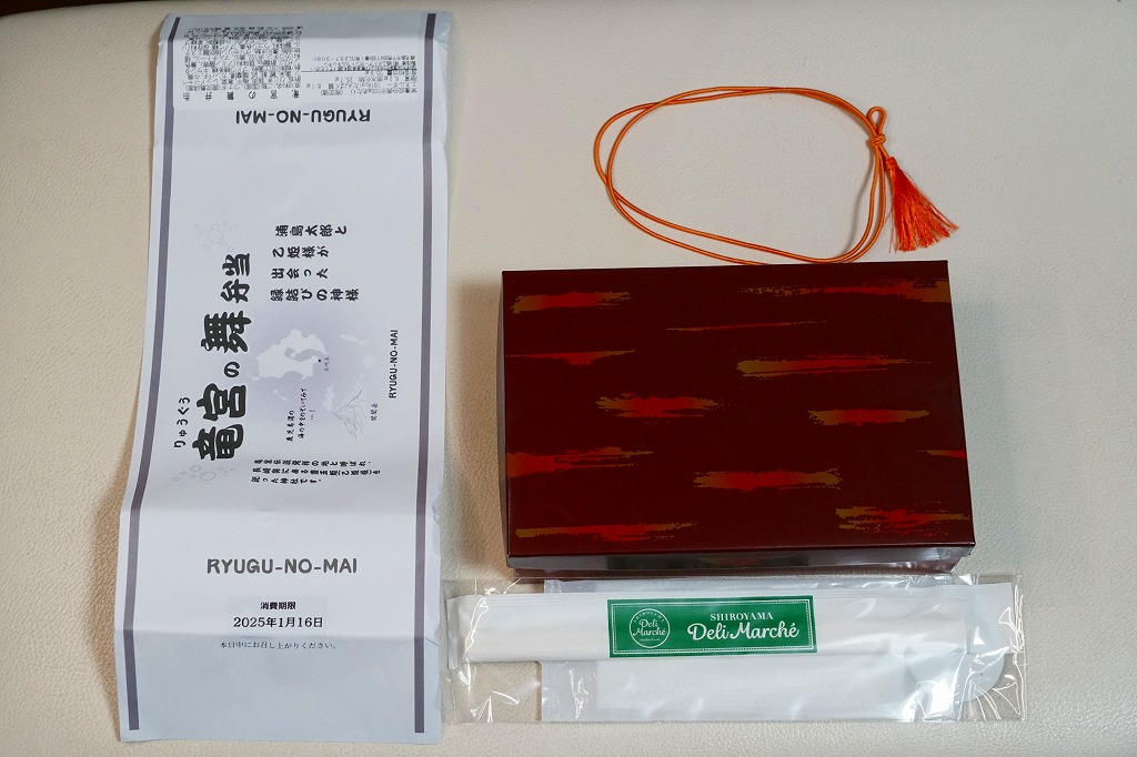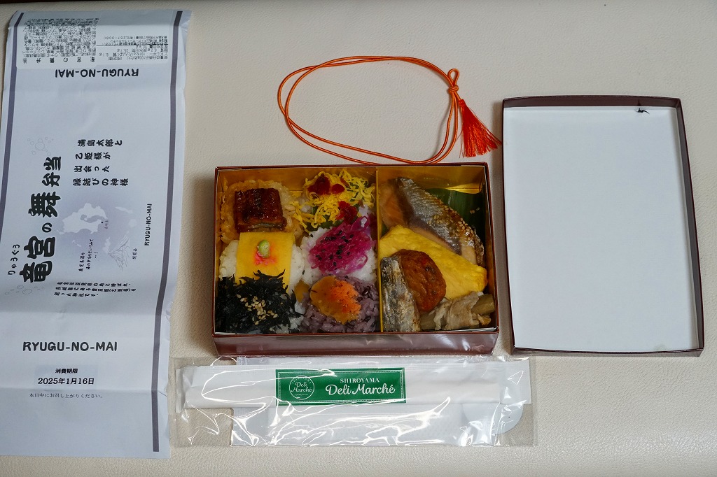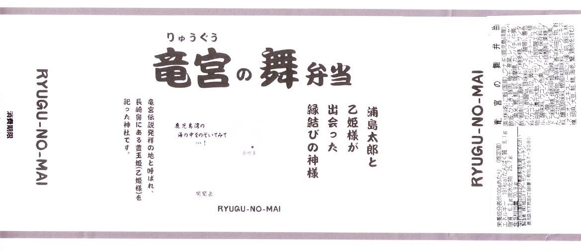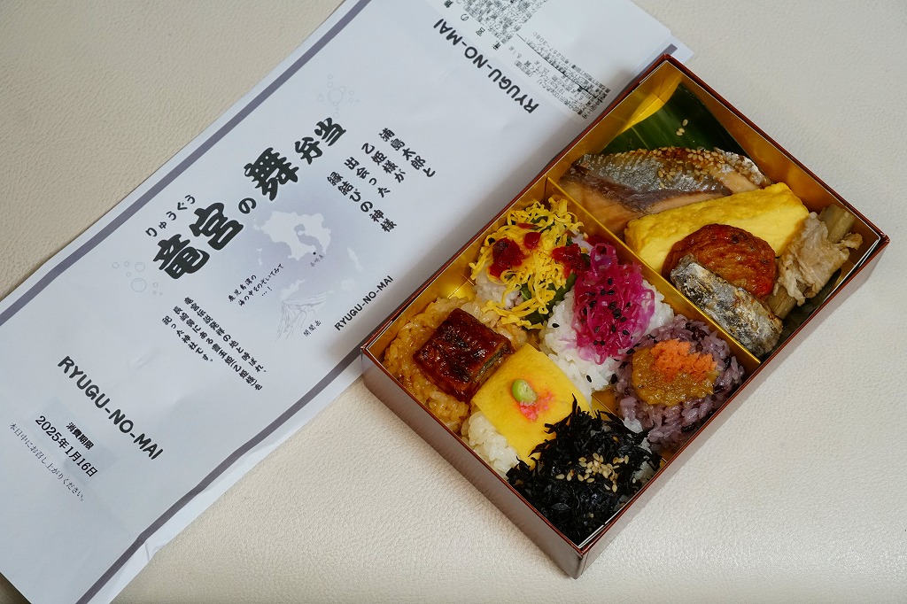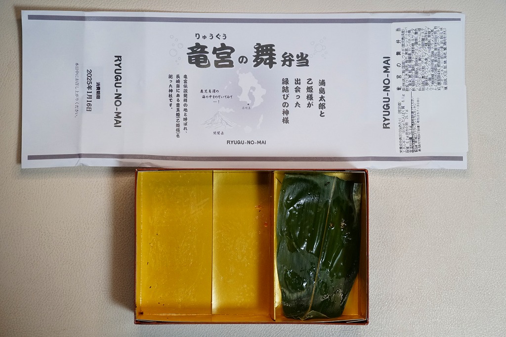 2025(令和7)年1月の京王百貨店の駅弁大会で、鹿児島県の指宿枕崎線の指宿駅の駅弁「りゅうぐうの舞」として実演販売。京王百貨店のプレスリリースを読み込めば、同線の観光特急列車「指宿のたまて箱」の車内受取限定弁当「指宿のたまて箱弁当」をモチーフにした弁当と判明するが、催事では指宿駅の駅弁として、指宿のたまて箱の車内弁当として、宣伝し販売し紹介された。