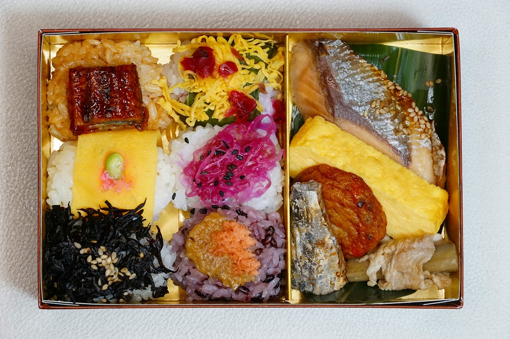 ということで、体裁は上記の車内弁当「指宿のたまて箱弁当」に似て、紙箱に白黒の掛紙を巻いてゴムでしばるもの。霧島熟成豚ひなもりポークを使用したひじき肉巻おにぎり、鹿児島大学農学部監修とした鹿児島県産の黒米と枕崎産のカツオミソを使用した黒米おにぎり、霧島産黒酢によるレッドキャベツ黒酢おにぎり、大隅産うなぎの手まり、鹿児島の味という甘いちらしずしとうす焼玉子の手まり、指宿の菜の花をイメージした高菜の手まりで6種のてまりおにぎりと、さつま半島南端黒豚カツ、南九州産のタマゴを使った玉子焼き、串木野産のさつま揚げ、垂水産カンパチの照焼き、枕崎産カツオ腹皮の塩焼き、霧島連山ひなもりポークのごぼう焼きを、おおむねタイル状に並べたり折り重ねた姿は車内弁当にそっくり。具材もだいたい同じ。