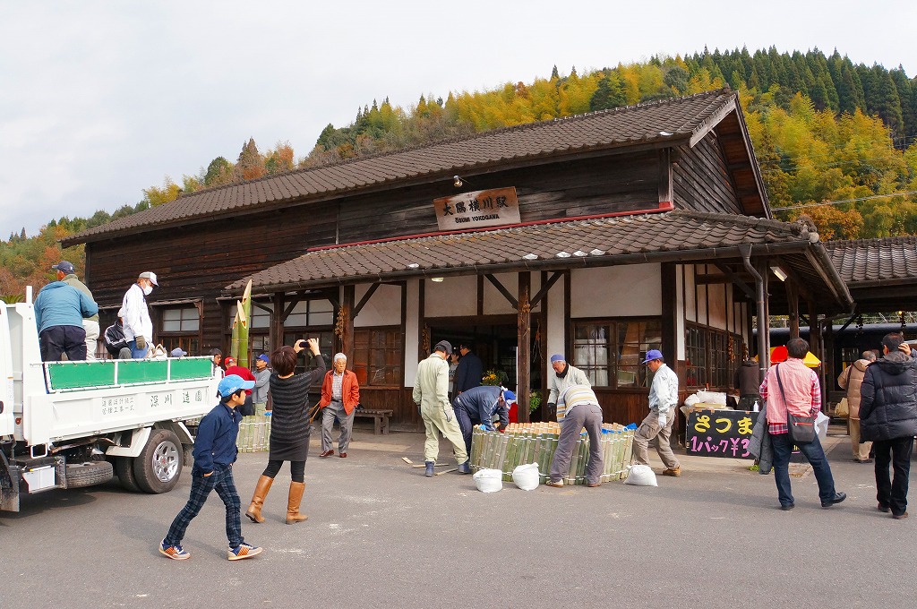 大隅横川駅もまた嘉例川駅と同じく、九州最古の木造駅舎を持つ無人駅。第二次大戦中の機銃掃射の痕跡がホーム上屋に残ることでも知られる。しかし2004年3月の観光特急「はやとの風」とともに観光地として花開いた嘉例川駅と違い、こちらは何もなく、何もせず、静かなままだった。それではまずいと考えたのだろうか、10年経った訪問当日の駅では嘉例川駅以上にスタッフと商品が駅に入り、駅前では門松を立てていた。なお、両駅は2005年11月の合併により、今は同じ霧島市内にある。