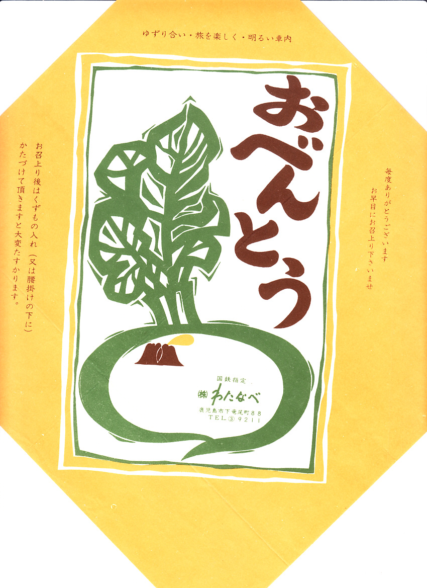 1960年代のものと思われる、昔の鹿児島の駅弁の掛紙。定価も駅名もないので、鹿児島駅や当時の西鹿児島駅の駅弁屋の仕出し弁当だろう。桜島大根に桜島の火山を小さく描いたようにみえたが、どうだろうか。
