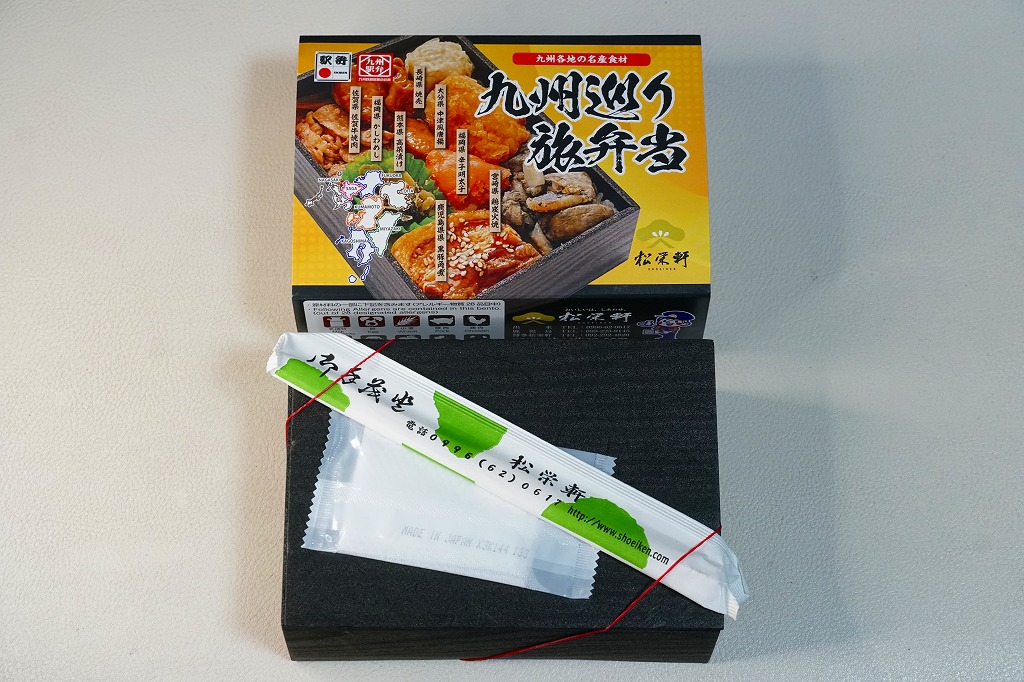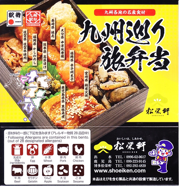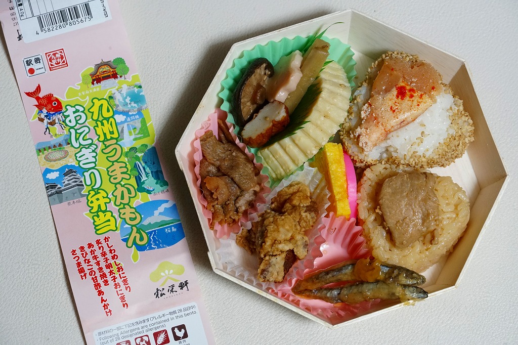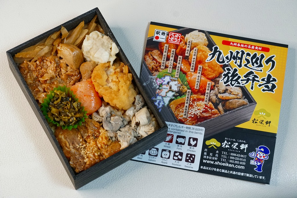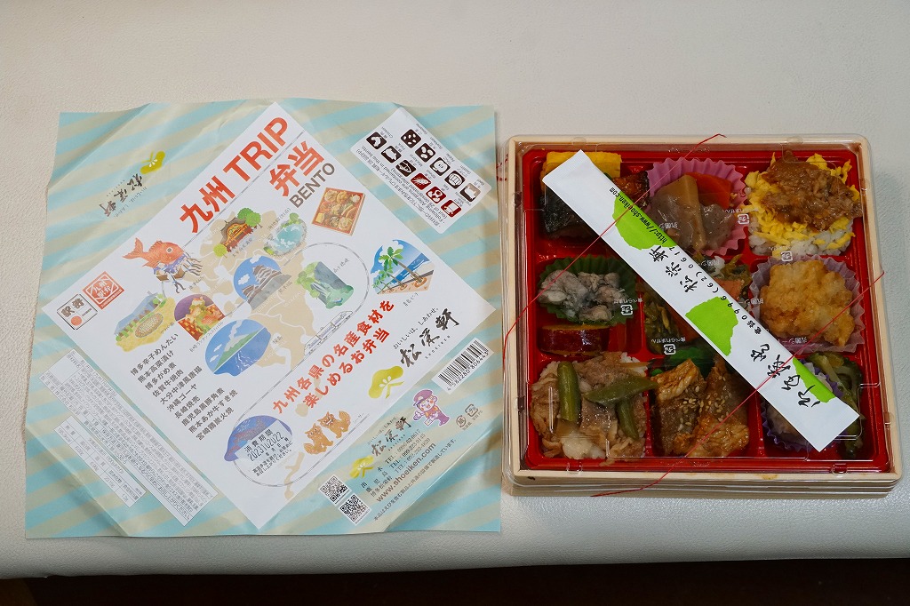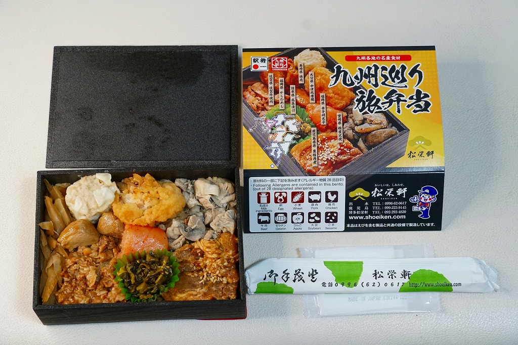 平たく浅い正方形のプラ容器に、九州各地のアイコンとおしながきを印刷した掛紙をかける。中身は博多辛子めんたい、熊本高菜漬け、博多がめ煮、佐賀牛焼肉、大分中津風唐揚、沖縄ゴーヤ、長崎焼売、鹿児島黒豚角煮、熊本あか牛すき焼、宮崎鶏炭火焼と記される。玉子焼、焼サバ、焼売、サツマイモも入る。お肉が強くて優勢な、忙しいお弁当。容器がコンビニ弁当並みに薄いので、分量は見た目ほどでない。味もそんなに効いてない。