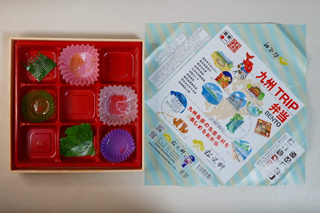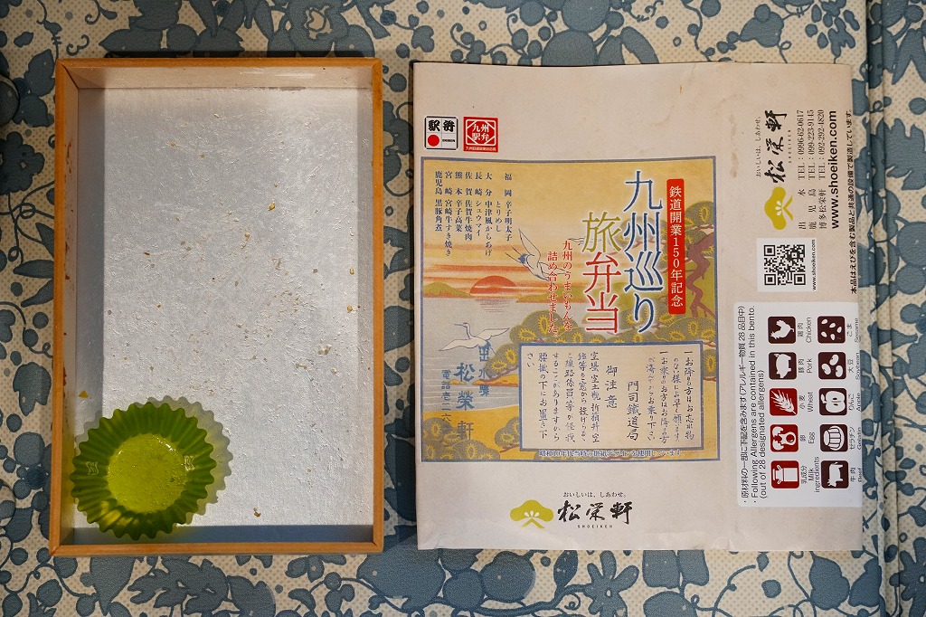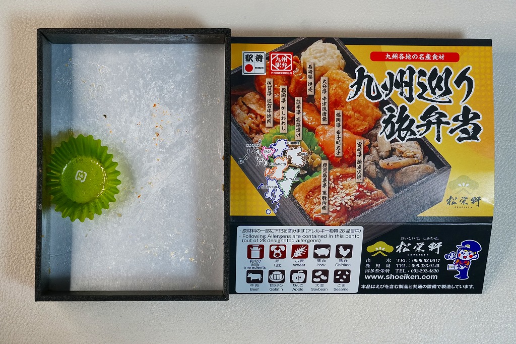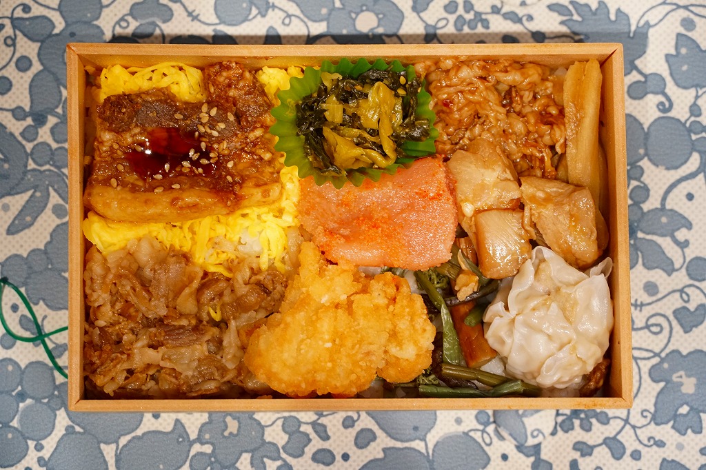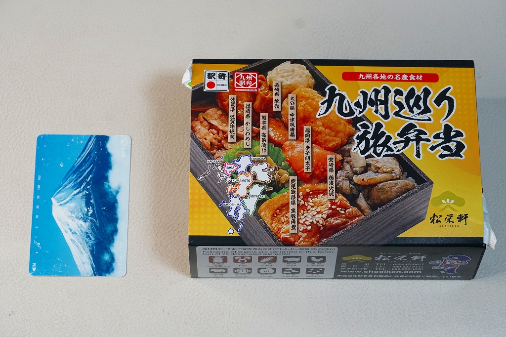 平たく浅い正方形のプラ容器に、九州各地のアイコンとおしながきを印刷した掛紙をかける。中身は博多辛子めんたい、熊本高菜漬け、博多がめ煮、佐賀牛焼肉、大分中津風唐揚、沖縄ゴーヤ、長崎焼売、鹿児島黒豚角煮、熊本あか牛すき焼、宮崎鶏炭火焼と記される。玉子焼、焼サバ、焼売、サツマイモも入る。お肉が強くて優勢な、忙しいお弁当。容器がコンビニ弁当並みに薄いので、分量は見た目ほどでない。味もそんなに効いてない。