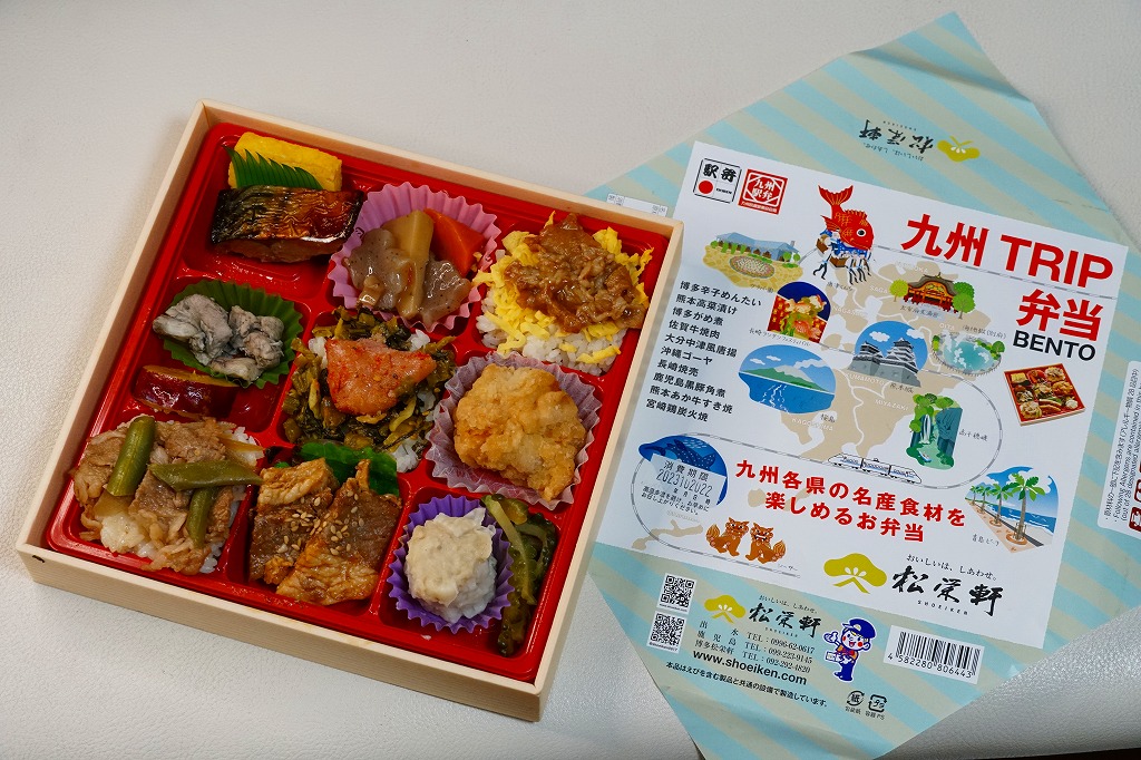 どうも2023(令和5)年10月に東京駅で発売し、鹿児島中央駅の駅弁を名乗りJR東日本の駅弁キャンペーン「駅弁味の陣2023」にエントリーした模様。既存の博多駅弁「KYUSHUTRIP弁当」と、名前と実質的な調製元と9区画のトレーの形が同じだが、リニューアルでなく博多と東京でそれぞれ売られ、中身と容器と価格が異なる。JR東日本の駅のコンビニ「ニューデイズ」各店へ出荷された日もあり、どうもこちらは催事向け商品か。