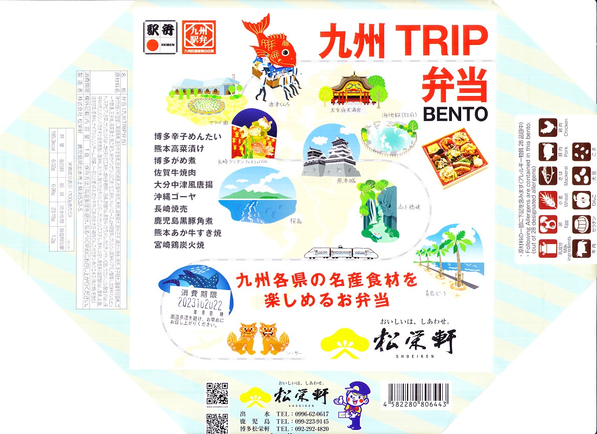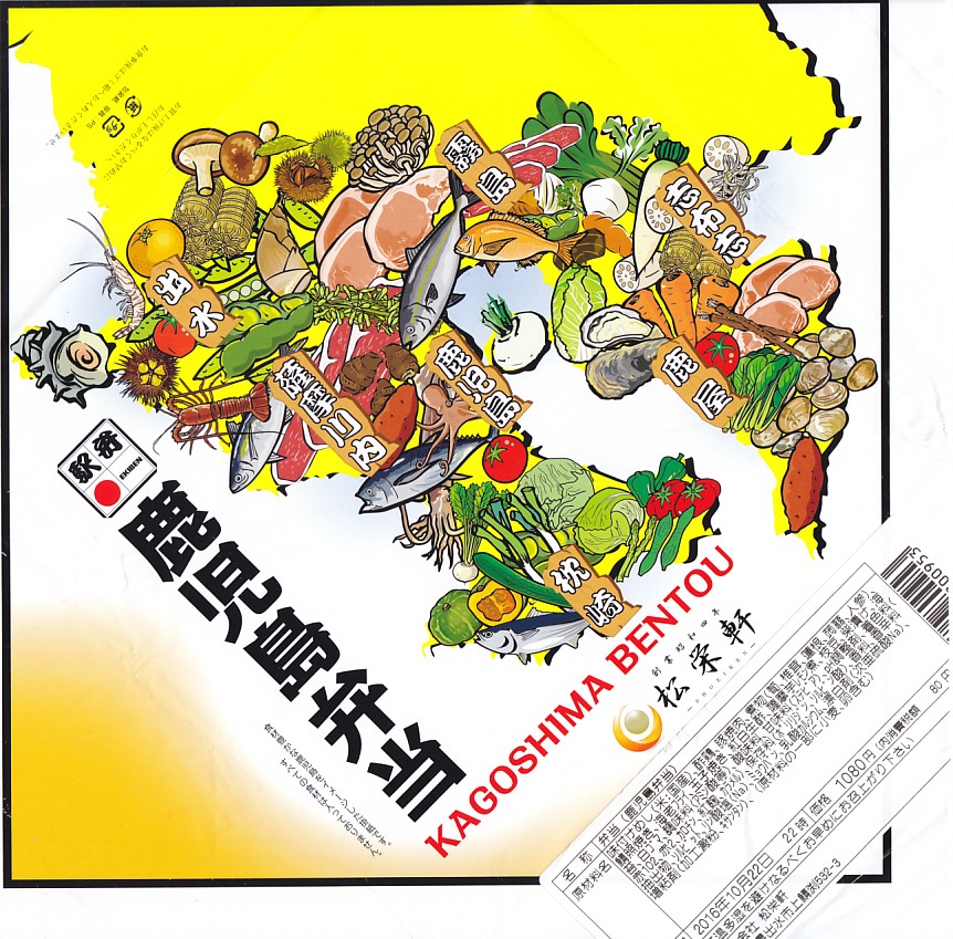 2016(平成28)年10月22日に購入した、鹿児島中央駅弁の掛紙。上記の2023年のものと比べて、法改正で記載事項が増えてレイアウトが変わったが、絵柄は同じ。容器も同じ。中身もだいたい同じ。