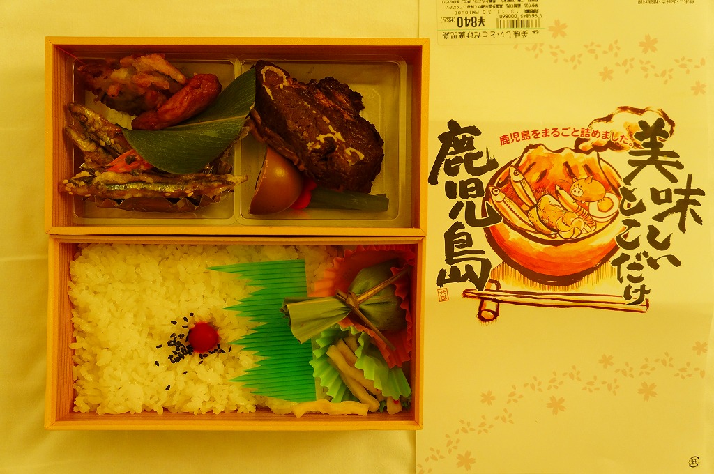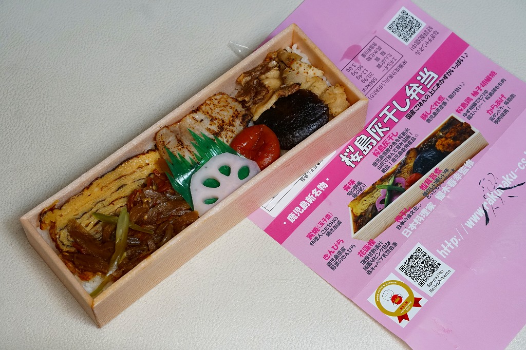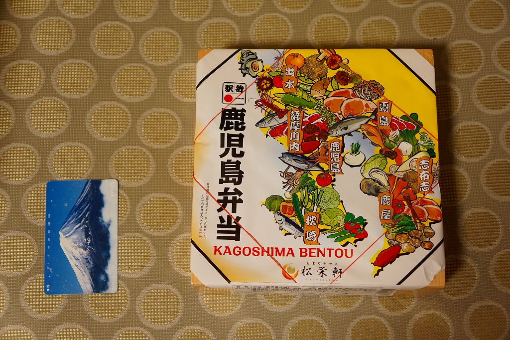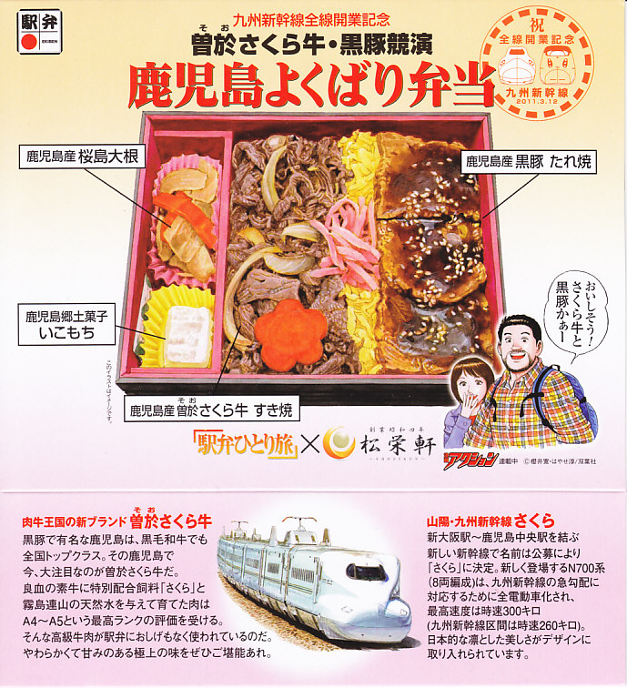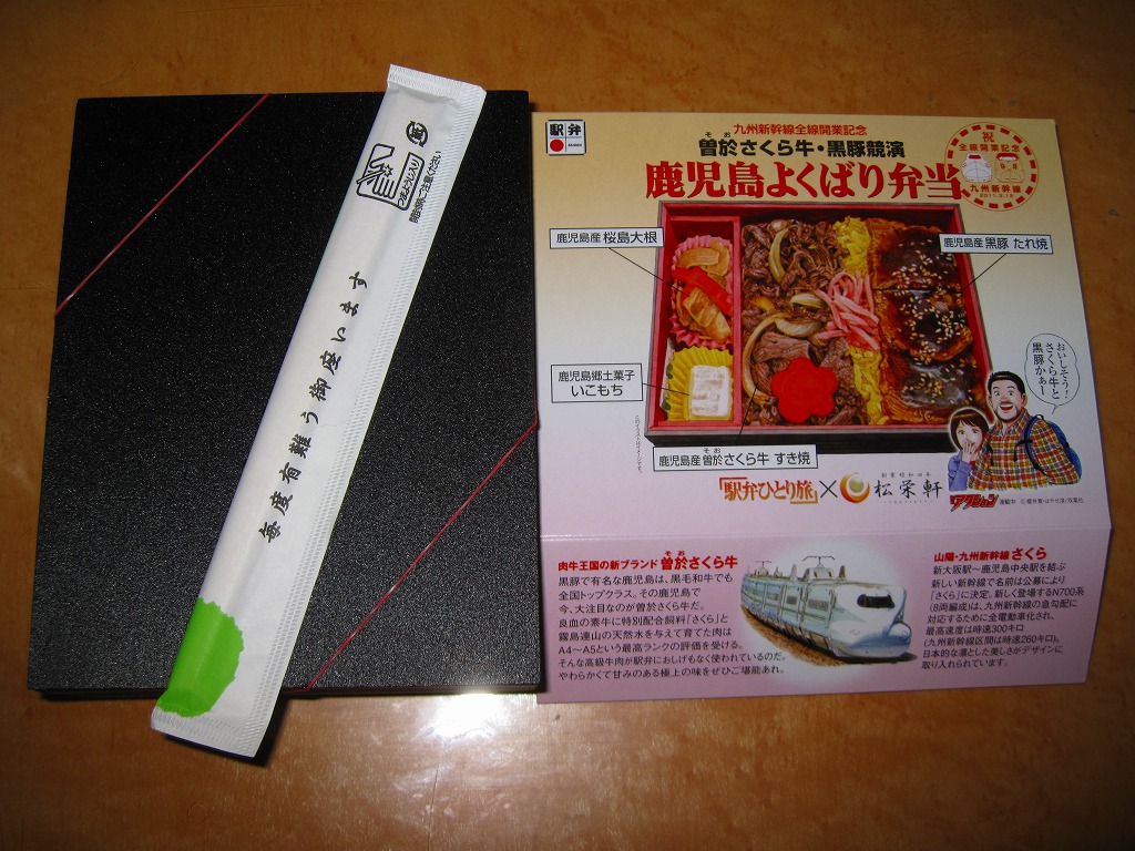 内側が赤く外側が黒い長方形の発泡材製容器を、中身のイラストに牛肉や新幹線の宣伝文を書いたボール紙の枠にはめる。中身はイラストのとおり、御飯の上を鹿児島産曽於(そお)さくら牛のすき焼、錦糸卵と紅生姜と花形ニンジン、鹿児島産黒豚たれ焼で3分の1ずつ覆い、桜島大根といこもちを添えるもの。甘い甘い牛肉と、スッキリした豚肉と、少量も肉の味を生かす御飯と、桜島大根といこもちの組合せが興味深い。価格以外には不満なし。価格は2011年の購入時で1,100円、2014年4月の消費税率改定で1,130円。2014年頃までの販売か。