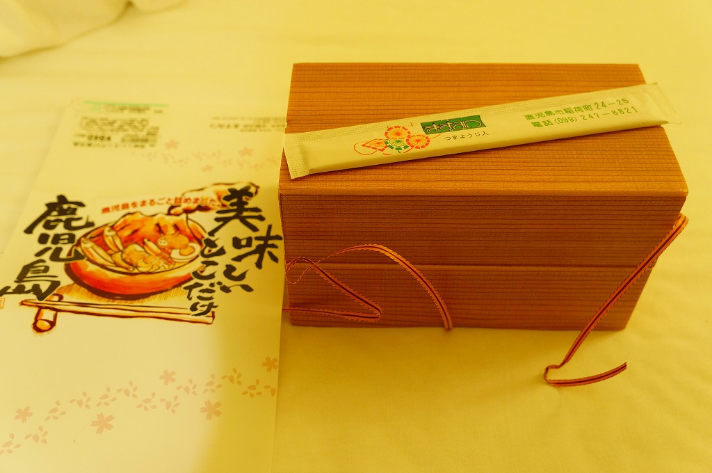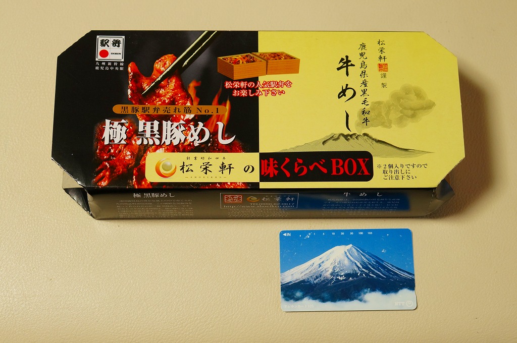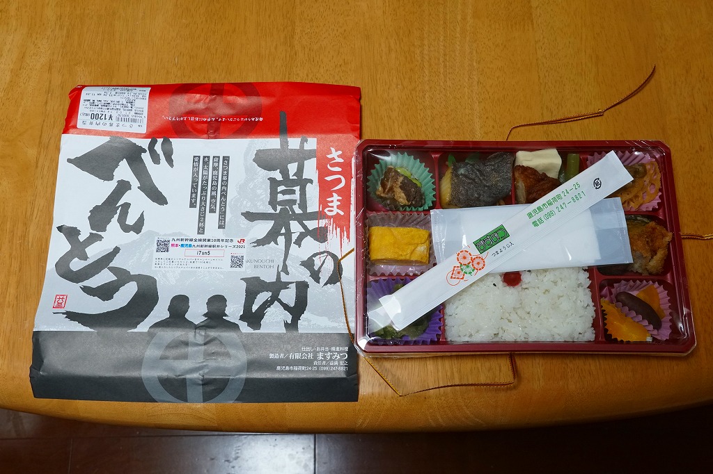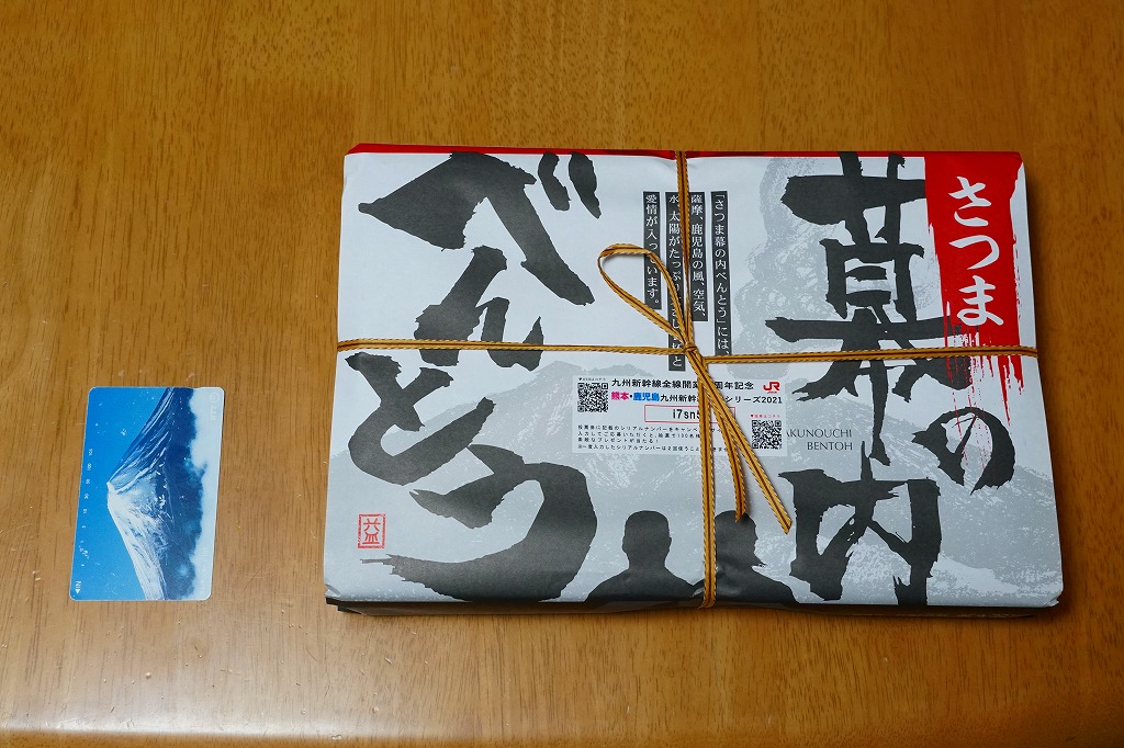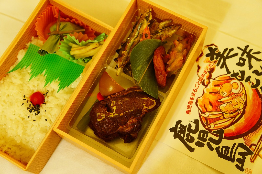内側が赤く外側が黒い長方形の発泡材製容器を、中身のイラストに牛肉や新幹線の宣伝文を書いたボール紙の枠にはめる。中身はイラストのとおり、御飯の上を鹿児島産曽於(そお)さくら牛のすき焼、錦糸卵と紅生姜と花形ニンジン、鹿児島産黒豚たれ焼で3分の1ずつ覆い、桜島大根といこもちを添えるもの。甘い甘い牛肉と、スッキリした豚肉と、少量も肉の味を生かす御飯と、桜島大根といこもちの組合せが興味深い。価格以外には不満なし。価格は2011年の購入時で1,100円、2014年4月の消費税率改定で1,130円。2014年頃までの販売か。