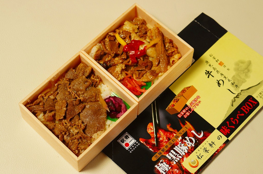 2012(平成24)年10月の発売で、同年のJR九州の駅弁キャンペーン「九州駅弁グランプリ(第9回)」にエントリー。商品名のとおり、見た目のとおり、松栄軒の出水駅の駅弁「極黒豚めし」と「牛めし」がひとつずつ。箸は一膳なので、ひとりで食べ比べる。2017年までの販売か。
