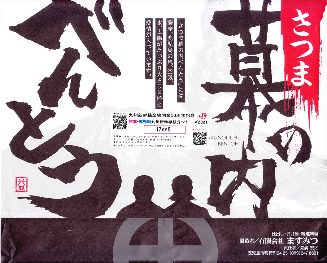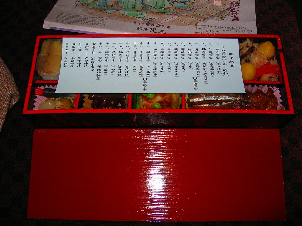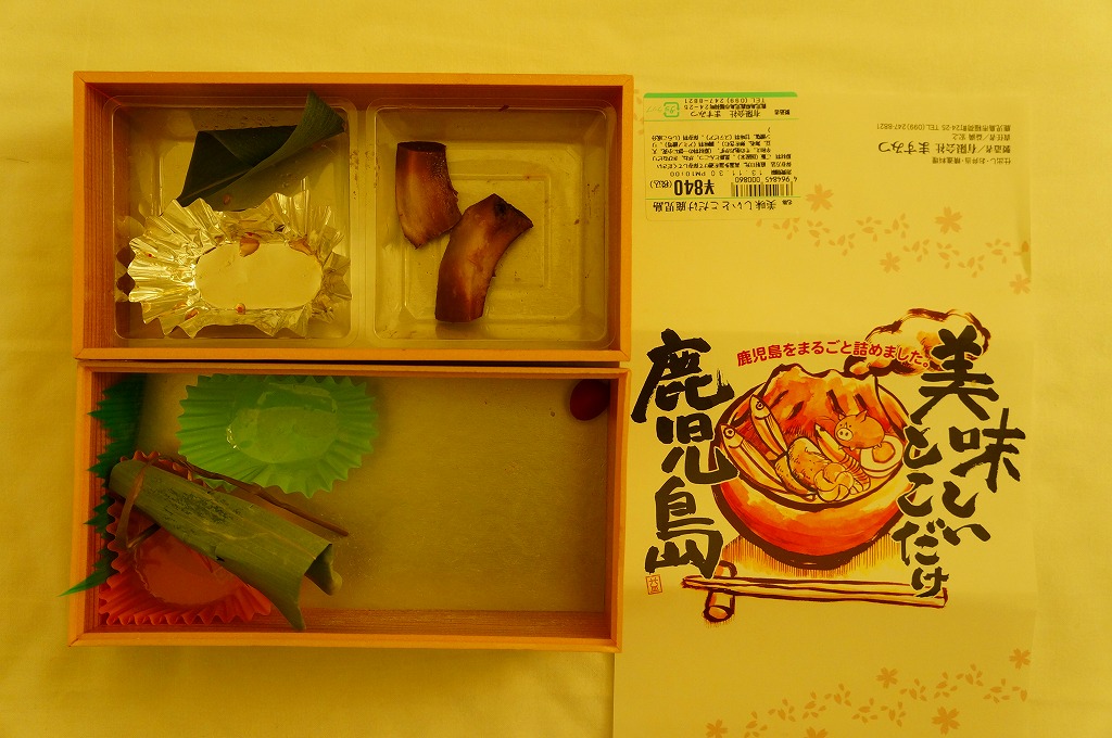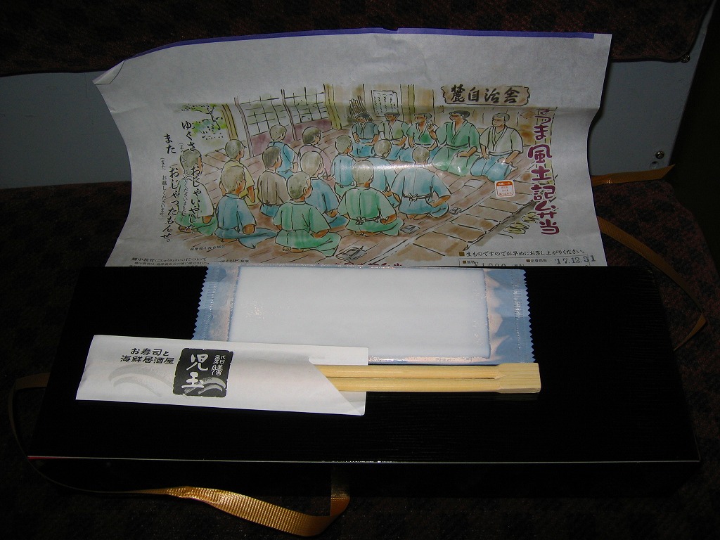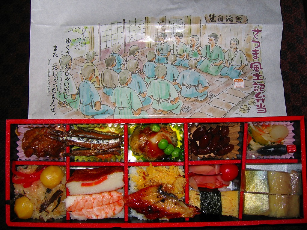 2005(平成17)年の春頃に発売か。フタも本体も黒く細長い容器に、割りばしとおしぼりを乗せて、郷中教育を描いた掛紙で巻いて、ビニールひもでしばる。中身は手前の5区画が御飯物で、左から栗めし・えび押寿司・うなぎ寿司・玉子の握り・サバ押寿司、奥の5区画にはとんこつ・きびなご・薩摩揚などという、多種中量の詰め合わせ。中身の解説は語られないが、自然に鹿児島にこだわった感じをちゃんと受け、鹿児島発着の列車で食べて風味が生きるもの。