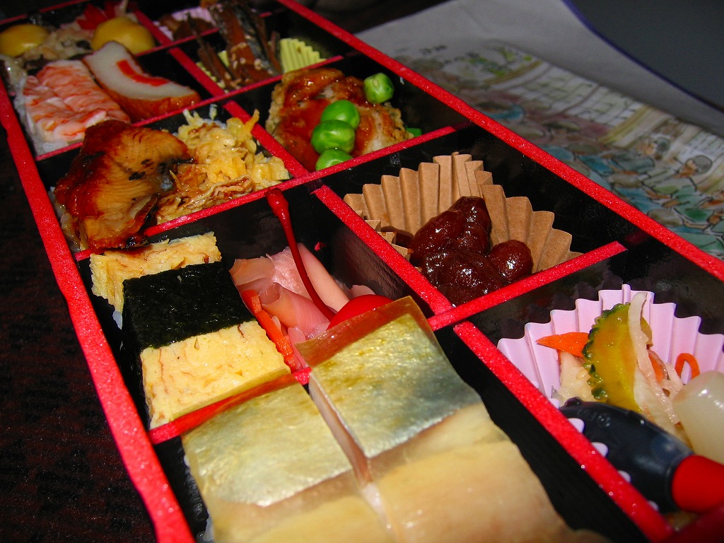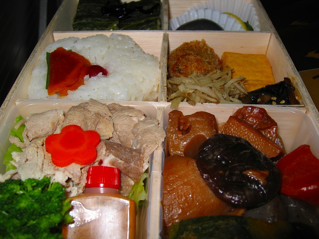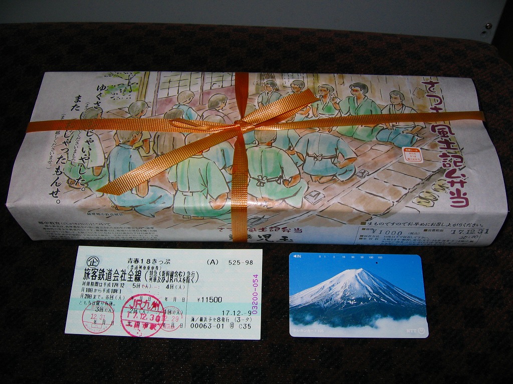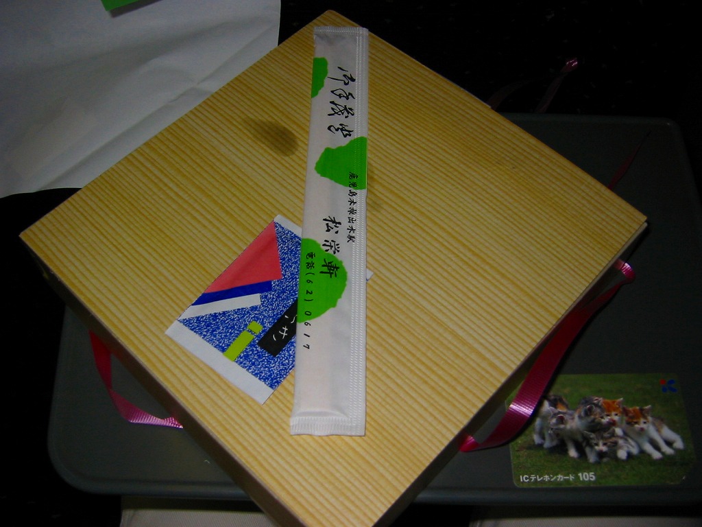 2005(平成17)年の春頃に発売か。フタも本体も黒く細長い容器に、割りばしとおしぼりを乗せて、郷中教育を描いた掛紙で巻いて、ビニールひもでしばる。中身は手前の5区画が御飯物で、左から栗めし・えび押寿司・うなぎ寿司・玉子の握り・サバ押寿司、奥の5区画にはとんこつ・きびなご・薩摩揚などという、多種中量の詰め合わせ。中身の解説は語られないが、自然に鹿児島にこだわった感じをちゃんと受け、鹿児島発着の列車で食べて風味が生きるもの。