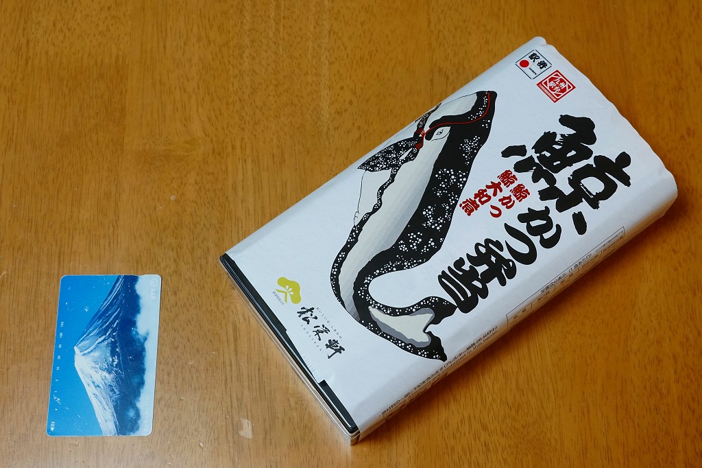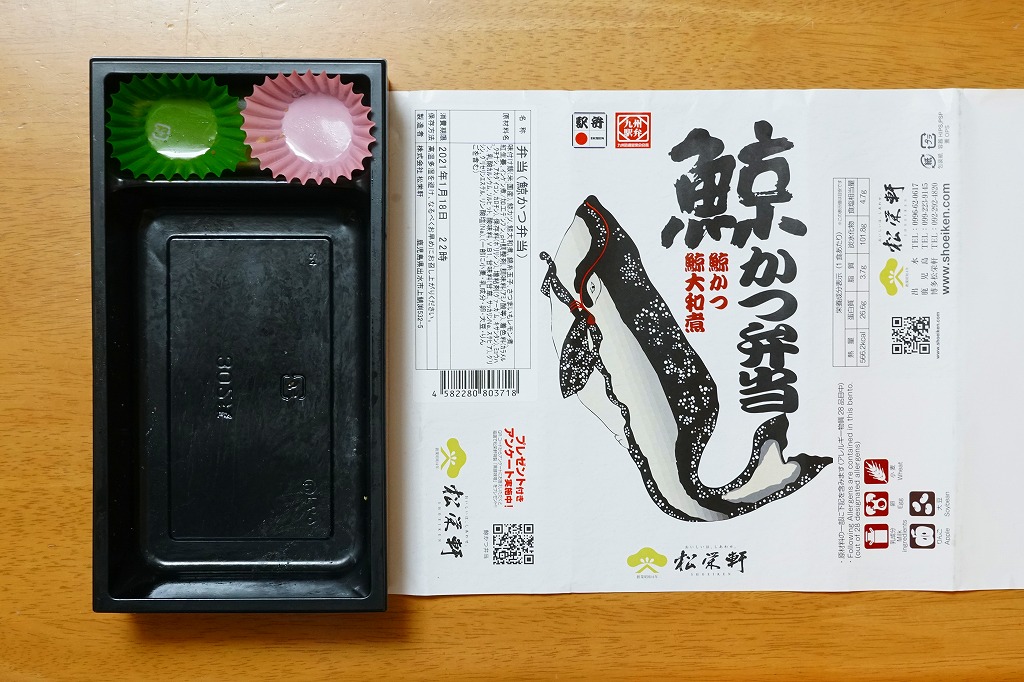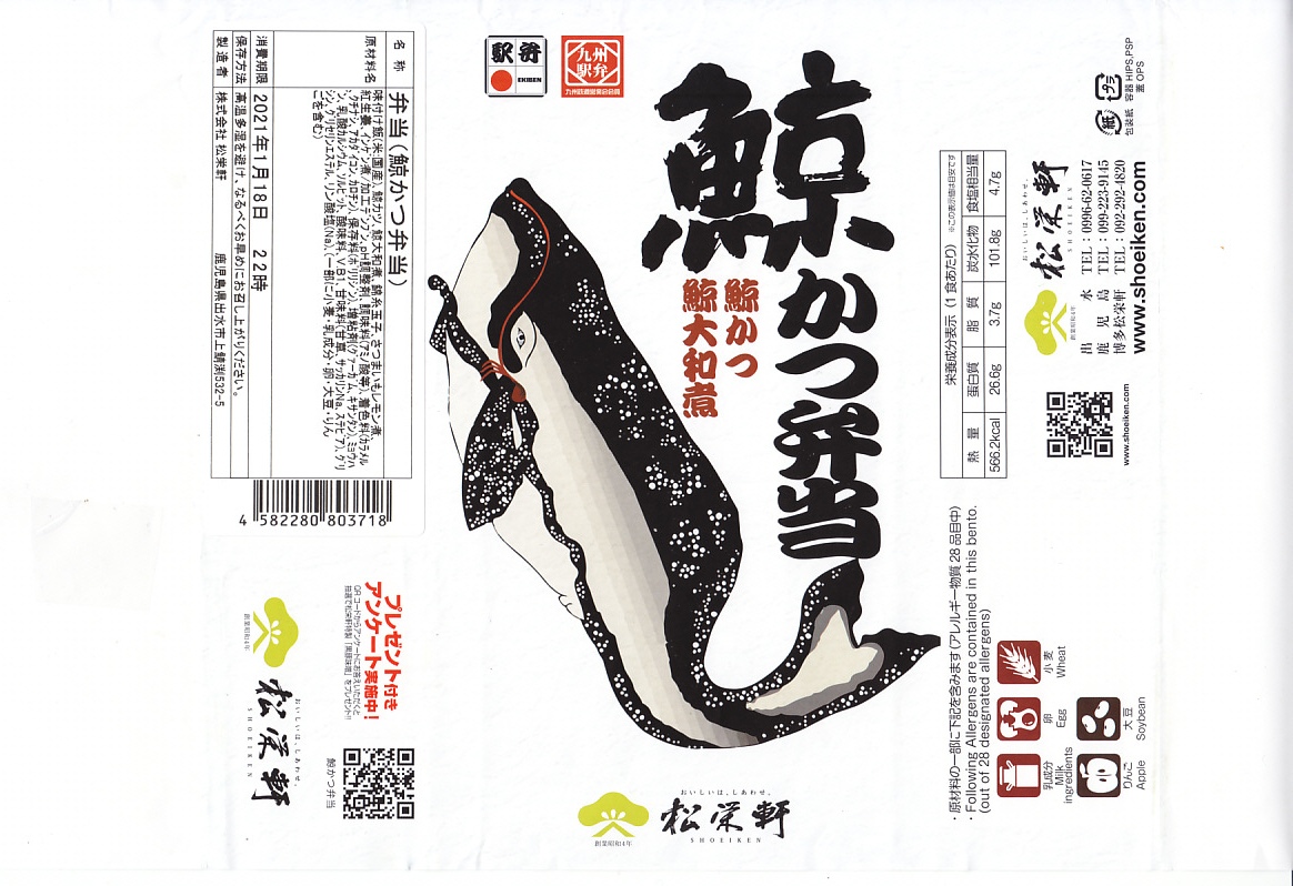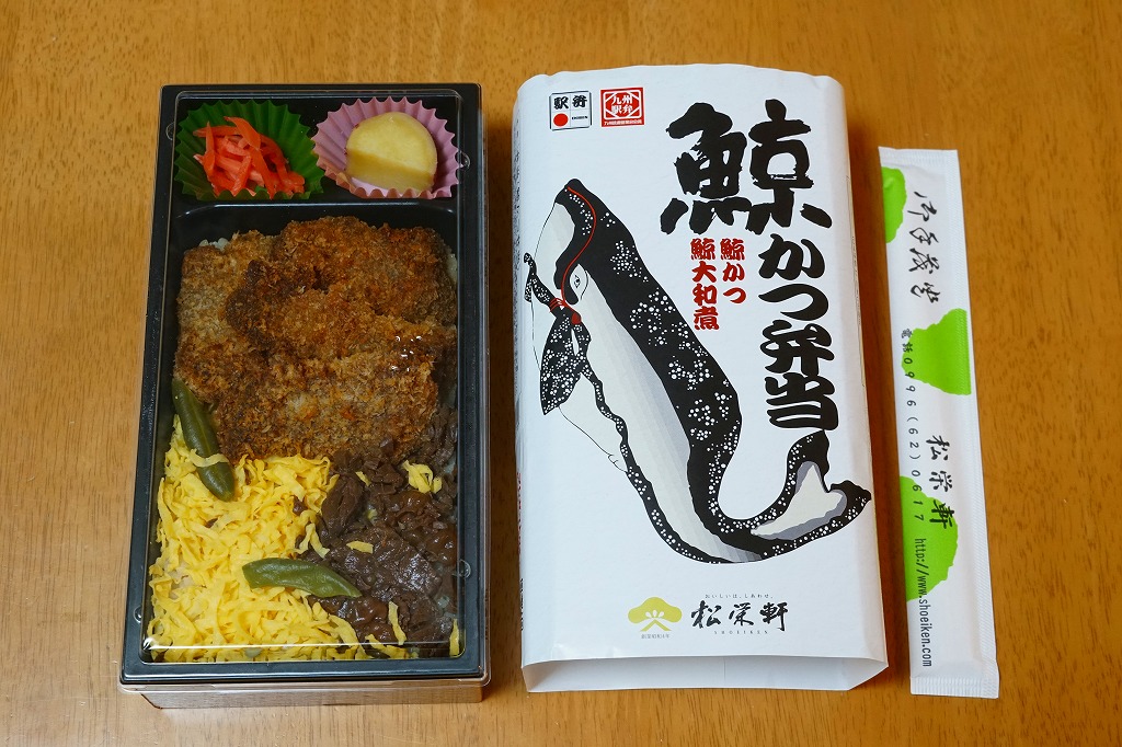 2020(令和2)年の2月までに発売か。現地でなく駅弁催事向けに出荷される商品かもしれない。茶飯をくじらカツとくじら大和煮と錦糸卵で覆い、インゲンで彩り、サツマイモと紅生姜を添える。長崎駅で「ながさき鯨カツ弁当」が生まれて定評を得てから約15年、この業界では珍しいことに、どんな駅弁屋も追わなかった、追えなかった、クジラの駅弁がついに出現した。しかし常温のくじらに臭みがひどく、他社が追わない理由を垣間見た気がした。それでも1年間は作られた模様。