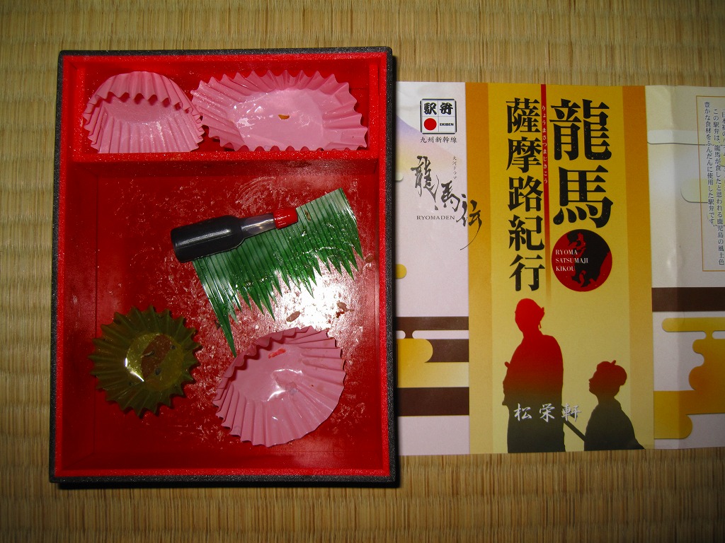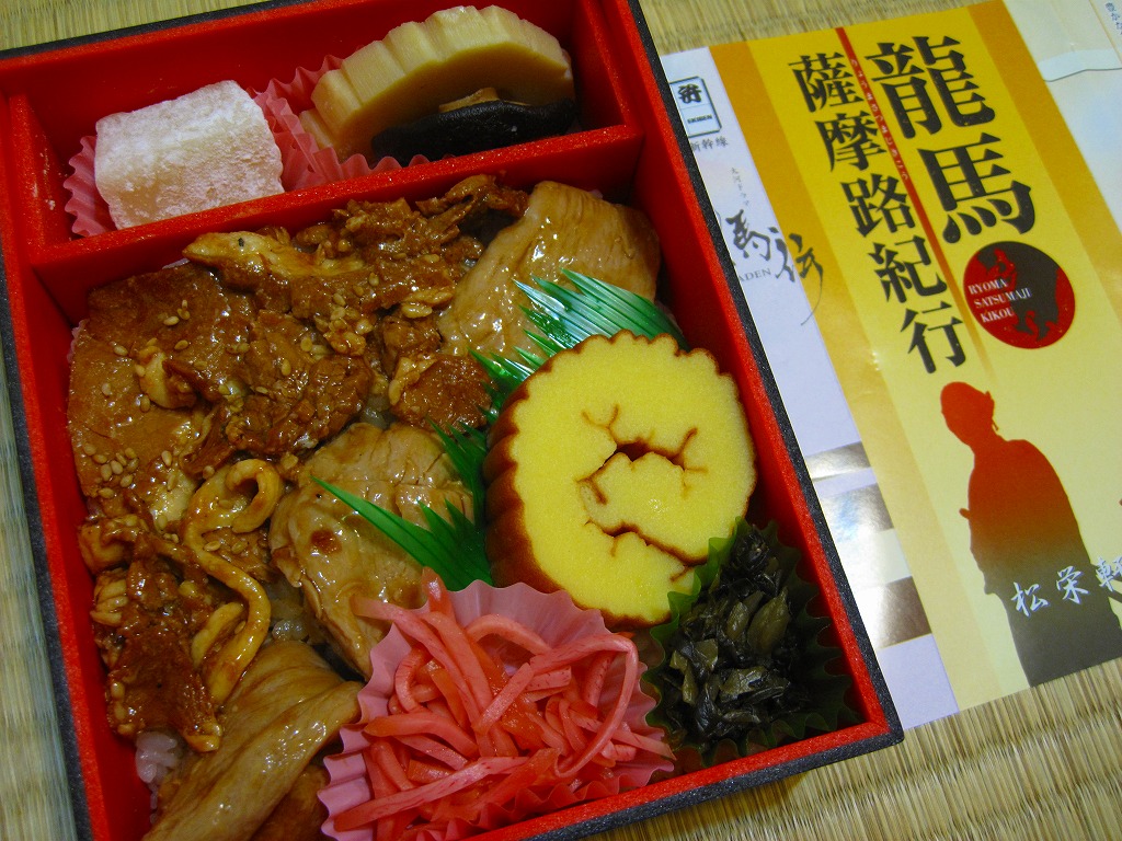 中身は味付飯の上に伊達巻、桜島とりの照焼き、黒豚の照焼き、高菜漬け、紅生姜を載せて、煮物といこもちを添えるもの。龍馬とお龍が鹿児島へ新婚旅行で訪れた時のイメージを駅弁にしたというが、何がそれに該当するのか分からない。伊達巻といこもちが印象的な、食べて良い味のする駅弁であった。出水駅の駅弁とされるが、実際は鹿児島中央駅で売られる模様。価格は2011年の購入時で1,050円、2014年4月の消費税率改定で1,080円。2014年までの販売か。