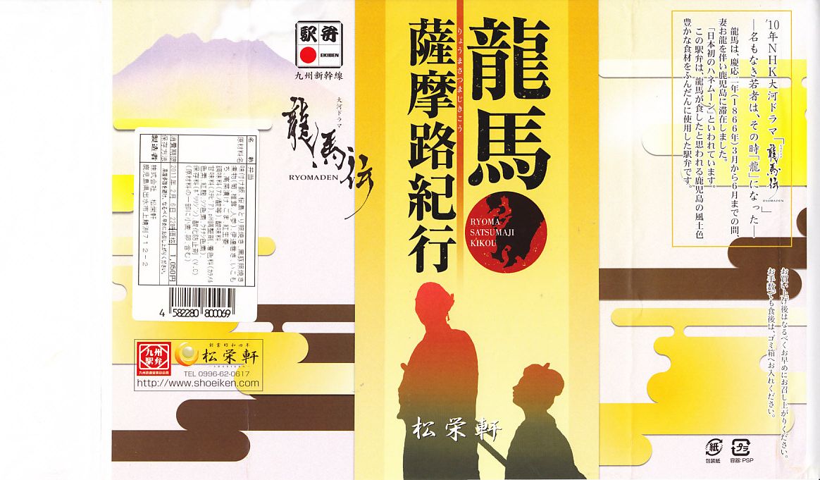 2010年のNHK大河ドラマ小説「龍馬伝」の放送に向けた2009(平成21)年12月に発売。内側が赤く外側が黒い長方形の容器に、桜島や坂本龍馬やお龍のシルエットなどをデザインして、駅弁マークと九州駅弁マークと大河ドラマの公式ロゴマークを付けた掛紙をかける。