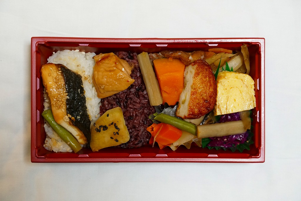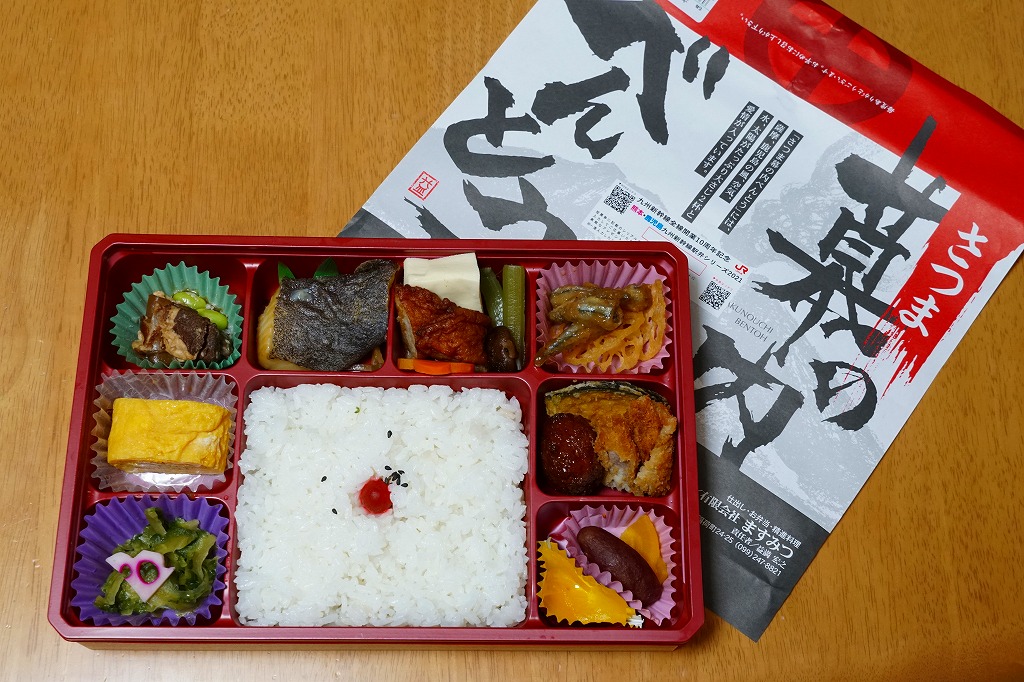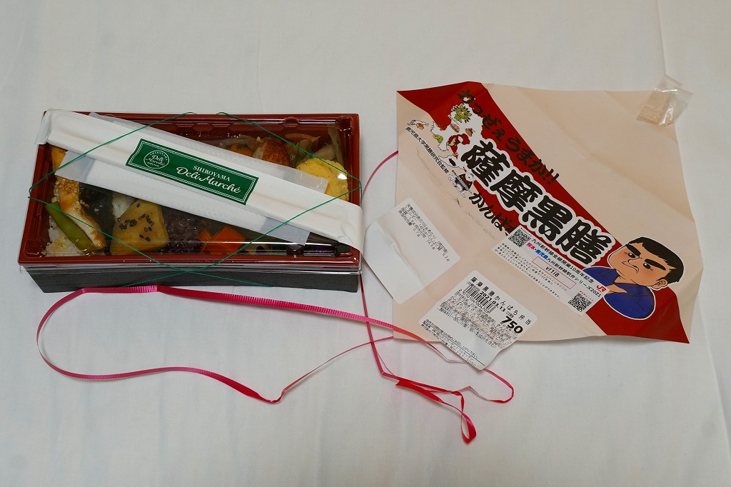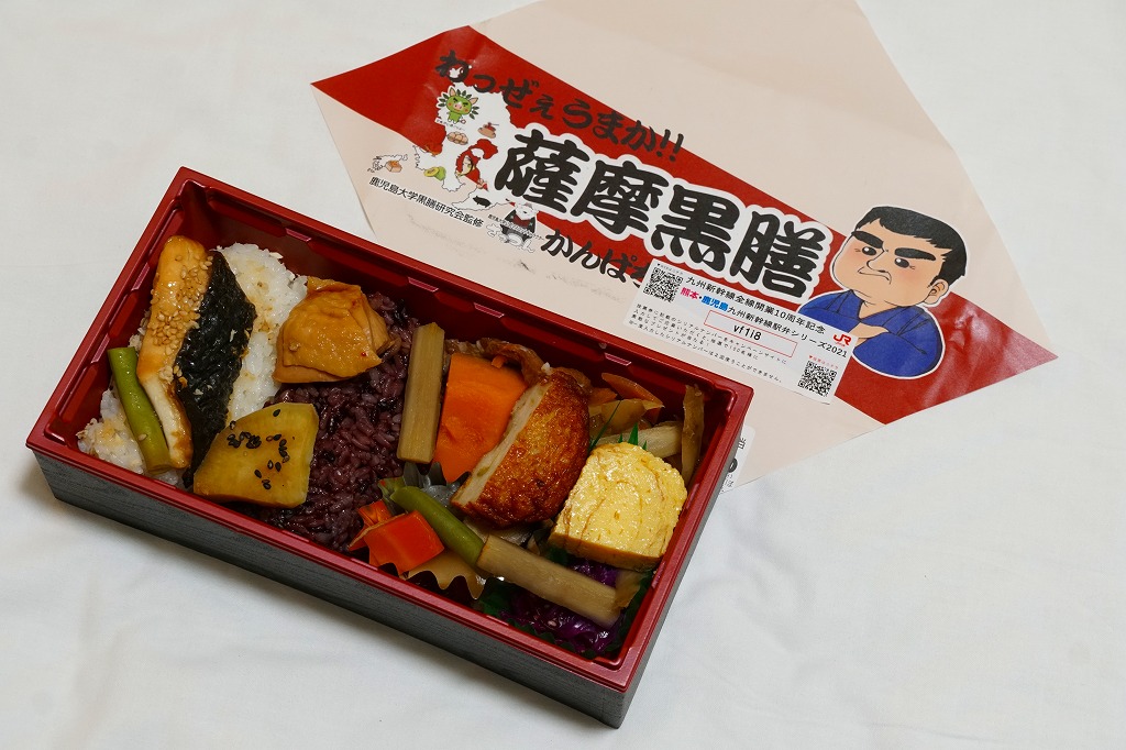長方形の容器に、黒米混じりの御飯と白飯とひとかたまりずつ詰め、カンパチの照焼、黒豚角煮、さつま鶏照煮、さつまあげ、きんぴらごぼう、こんにゃくやしいたけなどの煮物、玉子焼、レッドキャベツ酢の物などを散らしたり詰める。力強いような、雑然としたようなお弁当。調製元は鹿児島市内のスーパーマーケットチェーン。価格は2021年の購入時で750円、2023年10月のJR九州の駅弁キャンペーン「第14回九州駅弁グランプリ」エントリー時で、鹿児島中央駅では880円、博多駅では1,080円。