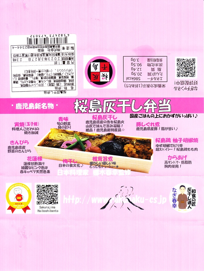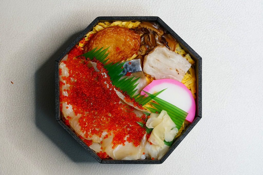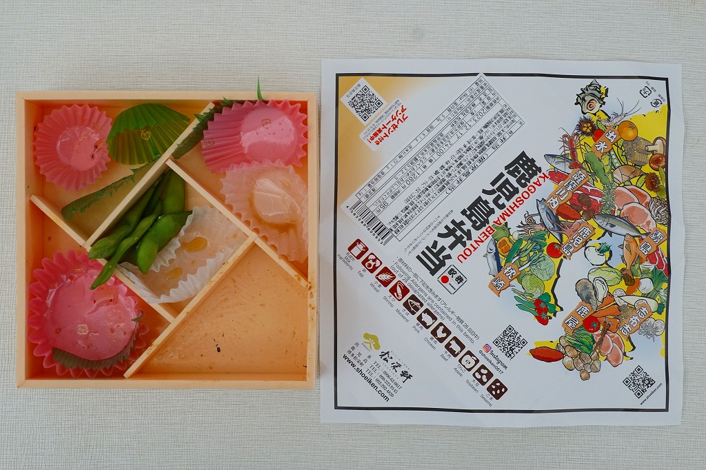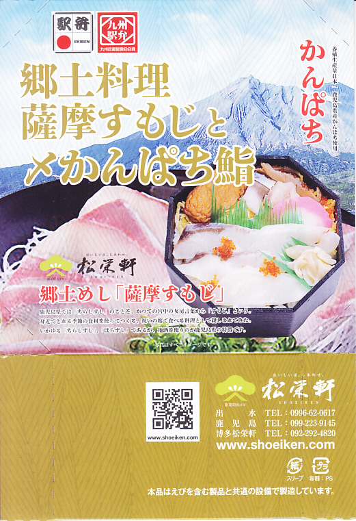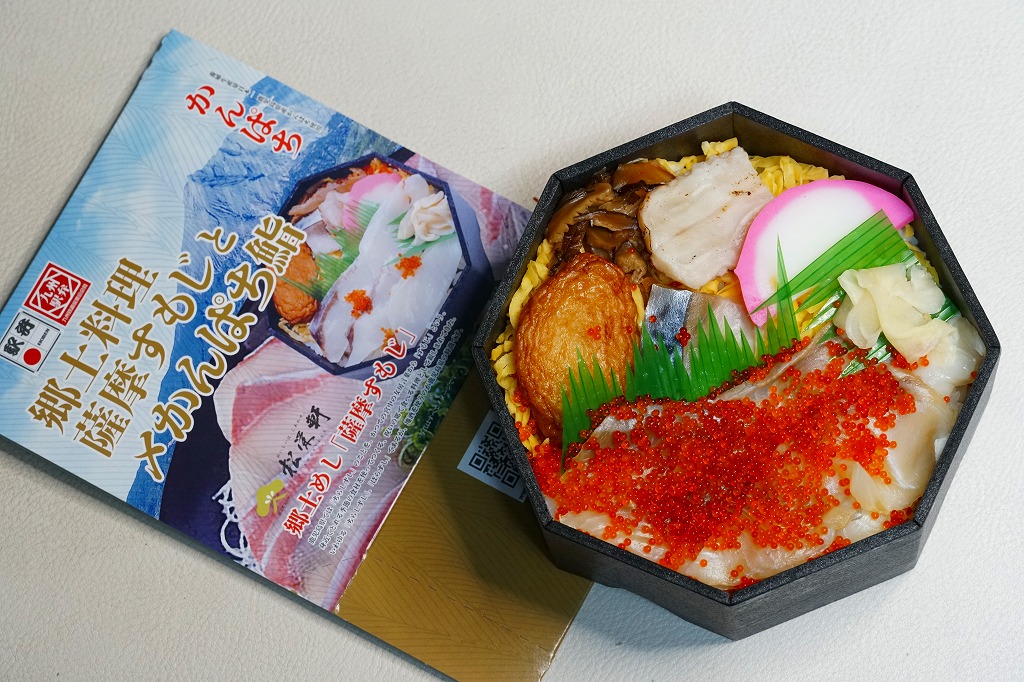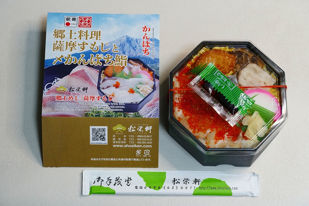 秋冬の駅弁大会シーズンに向けた、2021(令和3)年秋の新商品か。中身と桜島の写真を使うスリーブに収めた正八角形の容器に、酢飯を詰め、とびっこを載せたかんぱちの酢締めと錦糸卵で覆い、薩摩揚げ、かまぼこ、しめさば、タコ、刻みしいたけ煮、ガリを添える。酸味でいただく魚の弁当。催事にしか出てこない、ごくまれにしか出てこない、幻の弁当かもしれない。このシーズンの半年間のみの出荷か。