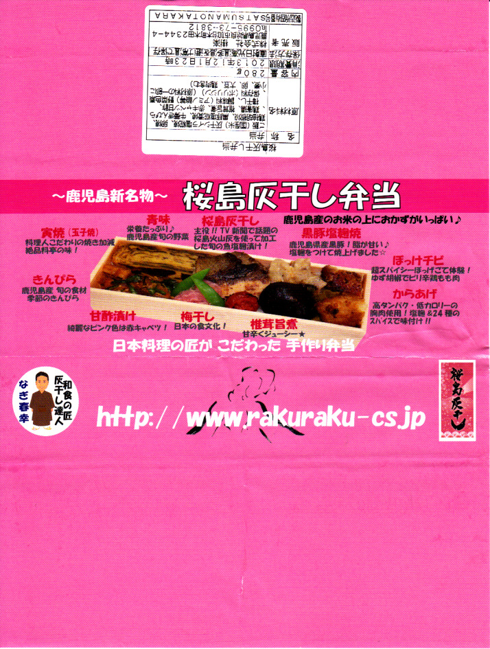2013(平成25)年12月1日に購入した、鹿児島中央駅弁の掛紙。絵柄も容器も中身も、上記の2023年のものと同じ。語句が微妙に異なるほか、当時はピンク色がもっときつかった。