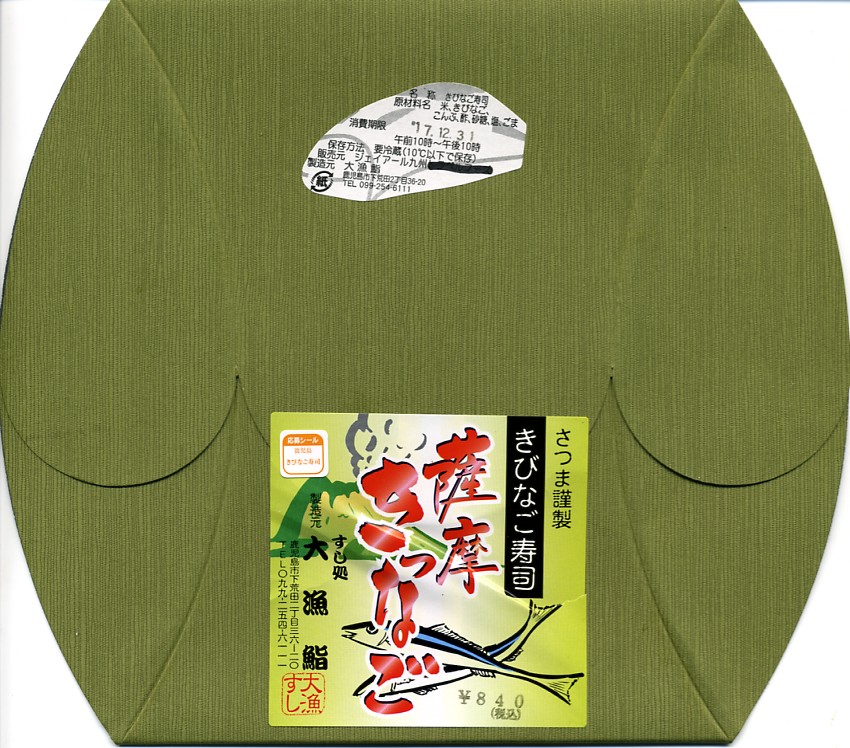 2004年3月の九州新幹線部分開業に合わせて発売。内部が銀色のボール紙を立体的に組み立てた中に、胡麻混じり酢飯の上や周囲にキビナゴの酢塩締めと昆布を貼る、鹿児島名物きびなご寿司を詰めて、商品名シールと針金入り紙帯で封をする。よそ者からすれば珍味に該当するだろう。普段見慣れない食材を見るだけで、旅の気分が盛り上がるし、品質も良いと思う。