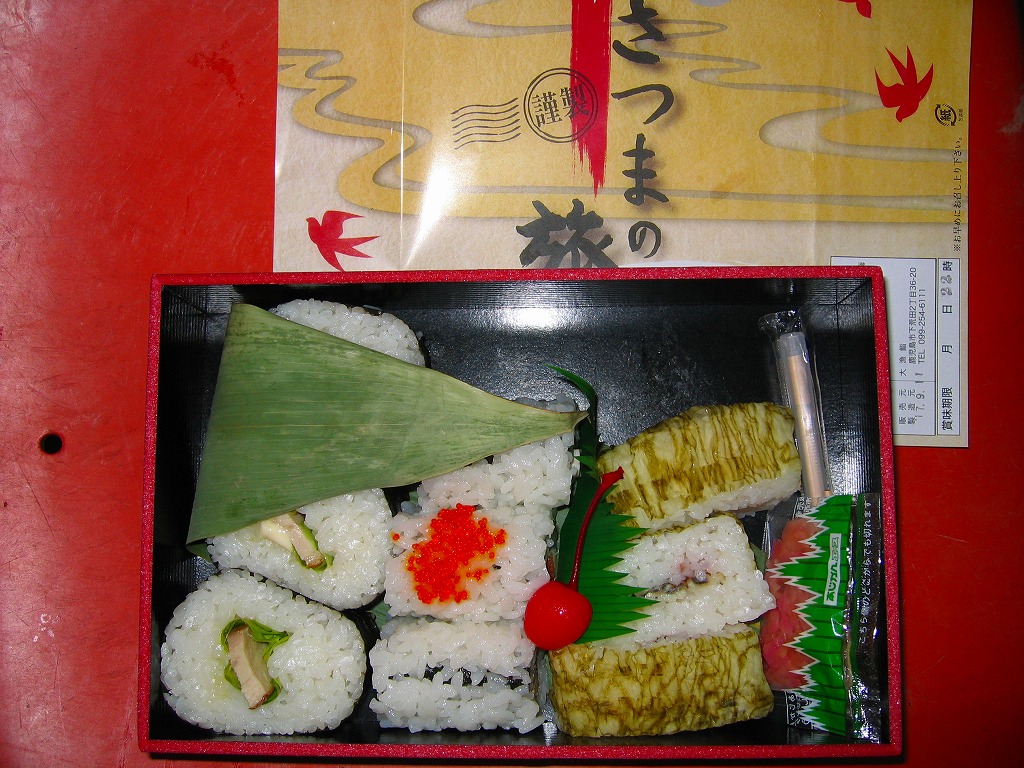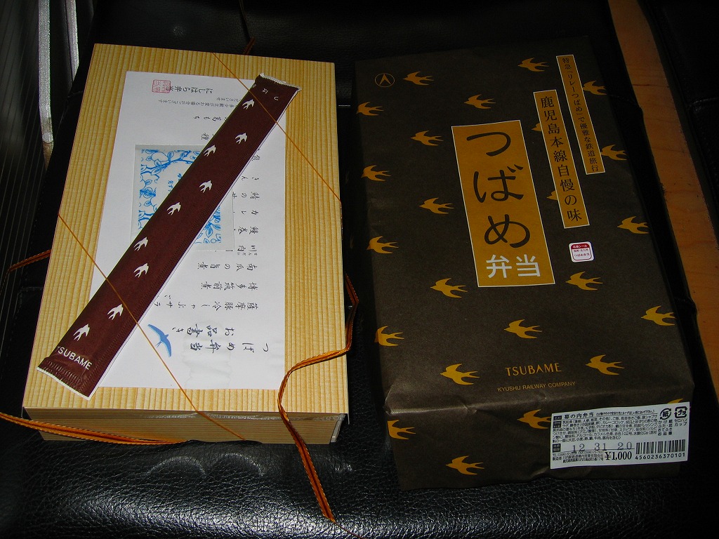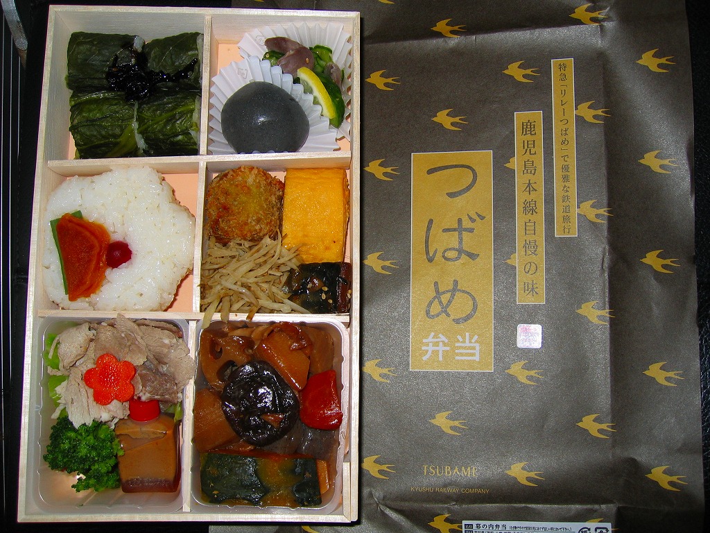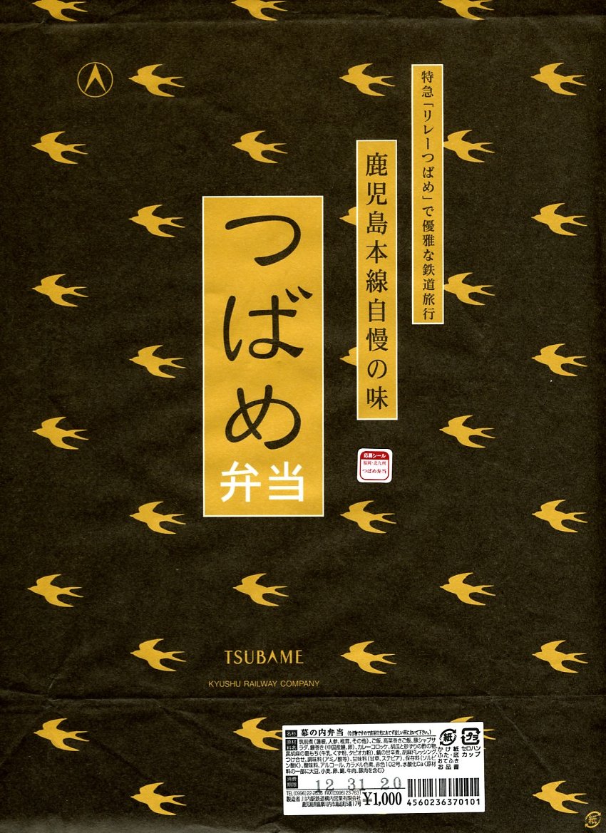2004(平成16)年3月の九州新幹線部分開業と同時か、その少々後に発売か。黒い長方形の容器に、よく見ると文字と車両と鳥でツバメが踊る掛紙を巻く。掛紙で980円の価格は、ゴム印で850円に訂正。中身は豚肉の太巻、鶏の細巻、きびなごの押寿司という珍味系。なんとなく主観的にも客観的にも印象に残りにくいような。調製元は鹿児島市内の出前専門寿司屋。2007年頃までに売り止めた模様。