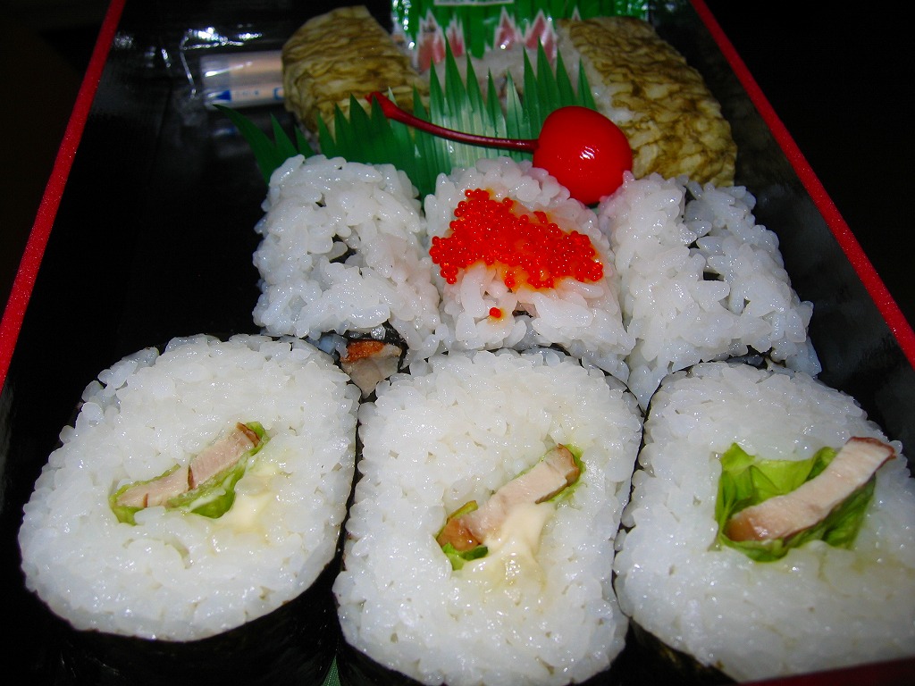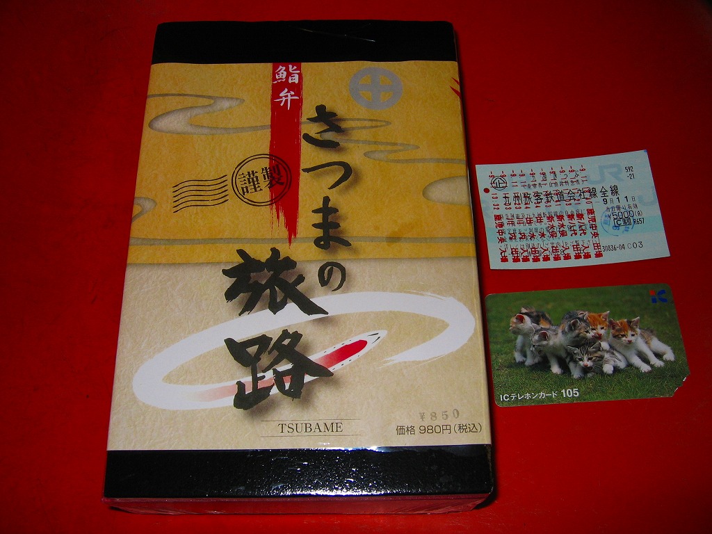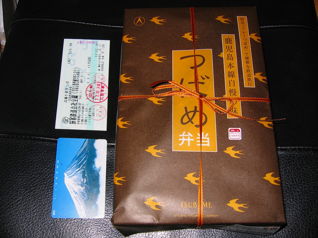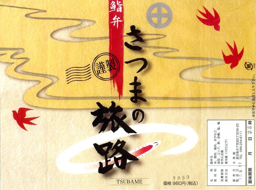 2004(平成16)年3月の九州新幹線部分開業と同時か、その少々後に発売か。黒い長方形の容器に、よく見ると文字と車両と鳥でツバメが踊る掛紙を巻く。掛紙で980円の価格は、ゴム印で850円に訂正。中身は豚肉の太巻、鶏の細巻、きびなごの押寿司という珍味系。なんとなく主観的にも客観的にも印象に残りにくいような。調製元は鹿児島市内の出前専門寿司屋。2007年頃までに売り止めた模様。