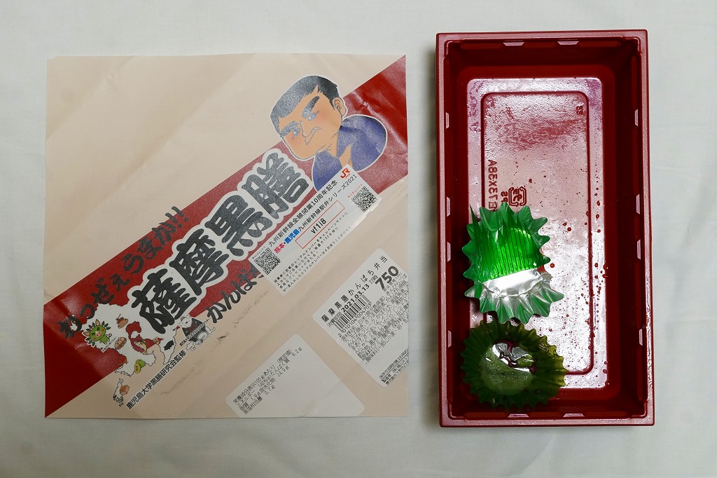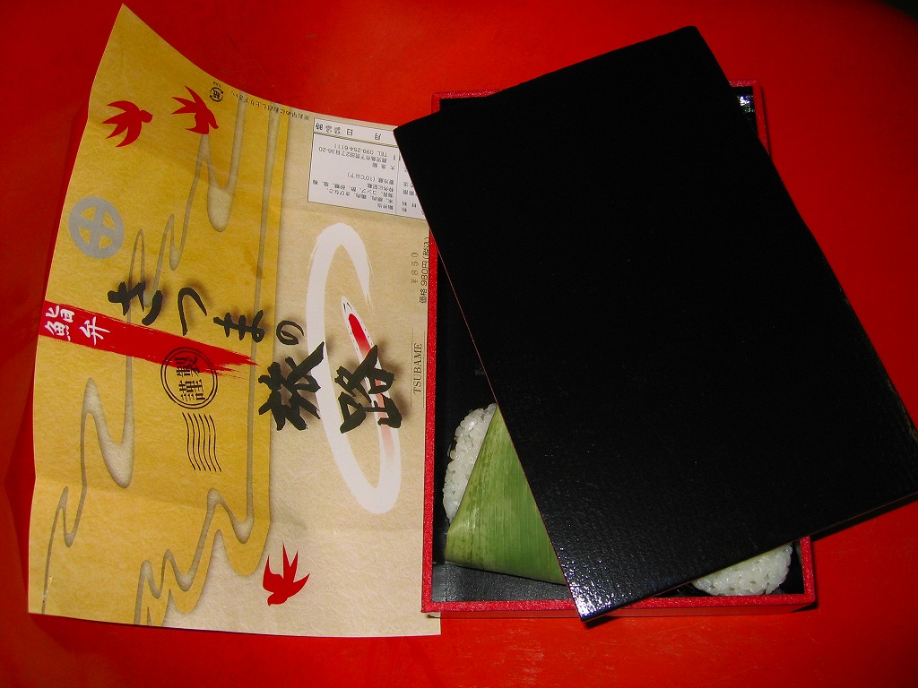 これはもともと、博多駅と西鹿児島駅を結んだ在来線特急「つばめ号」の車内販売用弁当。同じ価格と容器と掛紙で、博多の駅弁屋と鹿児島の業者が競作していたし、当時からそれぞれ博多駅と西鹿児島駅での販売もあったらしい。2004年の九州新幹線部分開業後も同様だが、新幹線つばめ号に車内販売はなく、在来線つばめ号改め「リレーつばめ号」は新八代駅より南に来ないので、鹿児島版は事実上、西鹿児島改め鹿児島中央駅の駅弁となった。