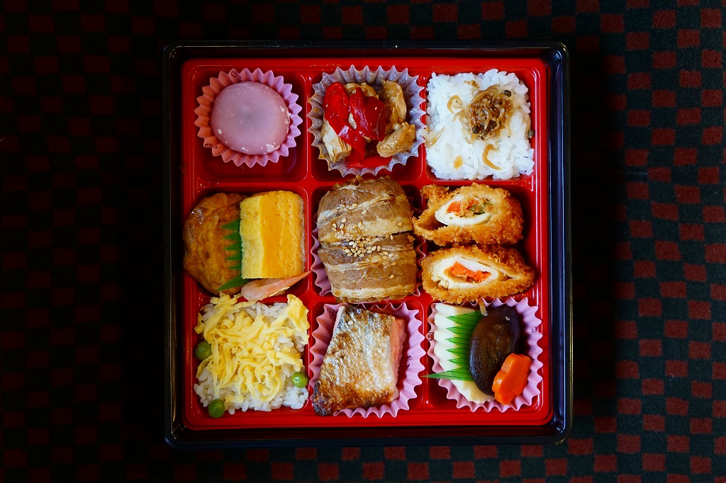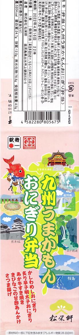 2015(平成27)年までに発売か。掛紙には鹿児島県の地図と食材のイラストが、おそらく産地と関連付けられて描かれる。中身は俵飯に漬物やサツマイモ、茶飯を覆う豚焼肉、鶏酢あんかけと枝豆、エビフライと煮物、サバ照焼とダイコンなどの酢の物と玉子焼。鹿児島でいろどりたくさん、もりだくさん。値段は2016年時点で1,080円、2019年10月から1,100円、2023年時点で1,280円。