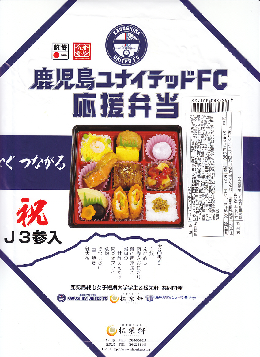 鹿児島県鹿児島市をホームタウンとするプロサッカークラブ「鹿児島ユナイテッドFC」が、2016年度にJリーグ(日本プロサッカーリーグ)のJ3リーグ(3部リーグ)に新規加盟したことを記念し、調製元と鹿児島純心女子短期大学との共同開発により、「ユナィテッ丼」(650円)とともに2016(平成28)年3月に発売。スタジアムでの販売を想定しているが、現物には全国と九州の駅弁マークが付き、こうやって駅で買える駅弁でもある。