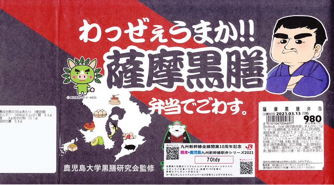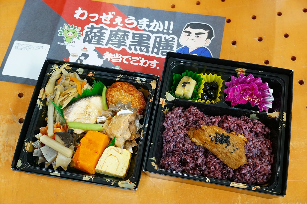 正方形の容器は二段重ね。上段が御飯で、黒米混じりの御飯に黒豚角煮の小片を載せて、黒豆やレッドキャベツ酢の物やサツマイモを添える。下段がおかずで、さつま鶏照煮、かんぱち照焼、さつまあげ、きんぴらごぼう、こんにゃくやしいたけなどの煮物、かぼちゃ、玉子焼など。会が定める黒膳条件に則って、黒を特徴とする鹿児島の食材と、ポリフェノール豊富な黒野菜を組み合わせた。分量の多い惣菜弁当。調製元は鹿児島市内のスーパーマーケットチェーン。価格は2021年の購入時で980円、2023年10月のJR九州の駅弁キャンペーン「第14回九州駅弁グランプリ」エントリー時で、鹿児島中央駅では1,100円、博多駅では1,300円。