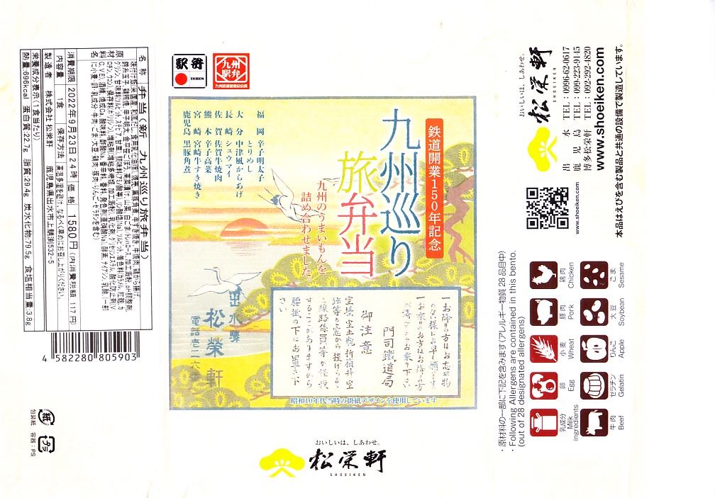 2022(令和4)年10月1日に鹿児島中央駅、熊本駅、博多駅、小倉駅、新大阪駅、名古屋駅、新横浜駅、東京駅で発売、12月31日まで販売。日本鉄道構内営業中央会の鉄道開業150年記念復刻駅弁企画により、同月から期間限定で販売された31社34駅弁のひとつ。さらにこの期間のJR九州の駅弁キャンペーン「第13回九州駅弁グランプリ」にエントリー。実際には2022年1月までにスーパーの駅弁大会などで売られ始めた「九州巡り旅弁当」を、9月に鉄道開業150年記念で一新して、やはりスーパーの駅弁大会などで売られ始めたもの。西九州新幹線の開業を前にした9月10日の長崎駅や諫早駅でも、現地の駅弁としてコンビニに出てきた。