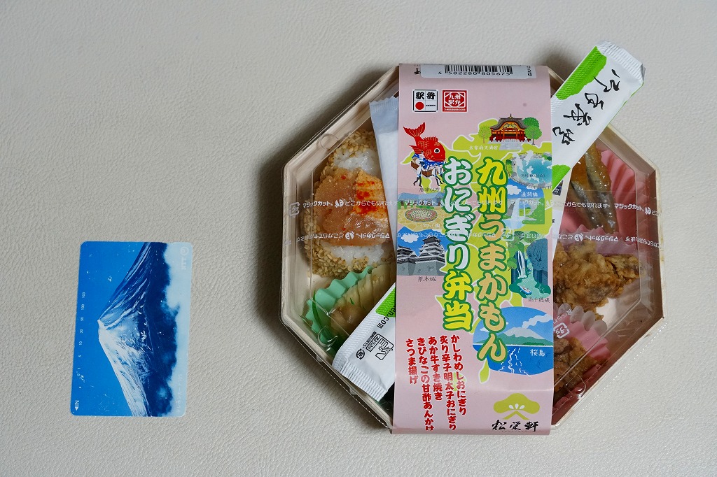 2022(令和4)年4月10日から5月10日まで、鹿児島や大阪や東京で販売。駅弁の日に合わせ、日本鉄道構内営業中央会の会員のうち21社が、FMヨコハマのラジオ番組「FUTURESCAPE」とタイアップし、この年の4月10日から各社の駅売店などで販売した、駅弁の日記念のおにぎり駅弁の、鹿児島中央駅バージョンとして販売。同会のリリースでは「九州うまかもんおむすび弁当」と発表し、その写真と実物には「九州うまかもんおにぎり弁当」と書いてある。今回のキャンペーンで各社に用意された「駅弁カード」が1枚付いてきた。