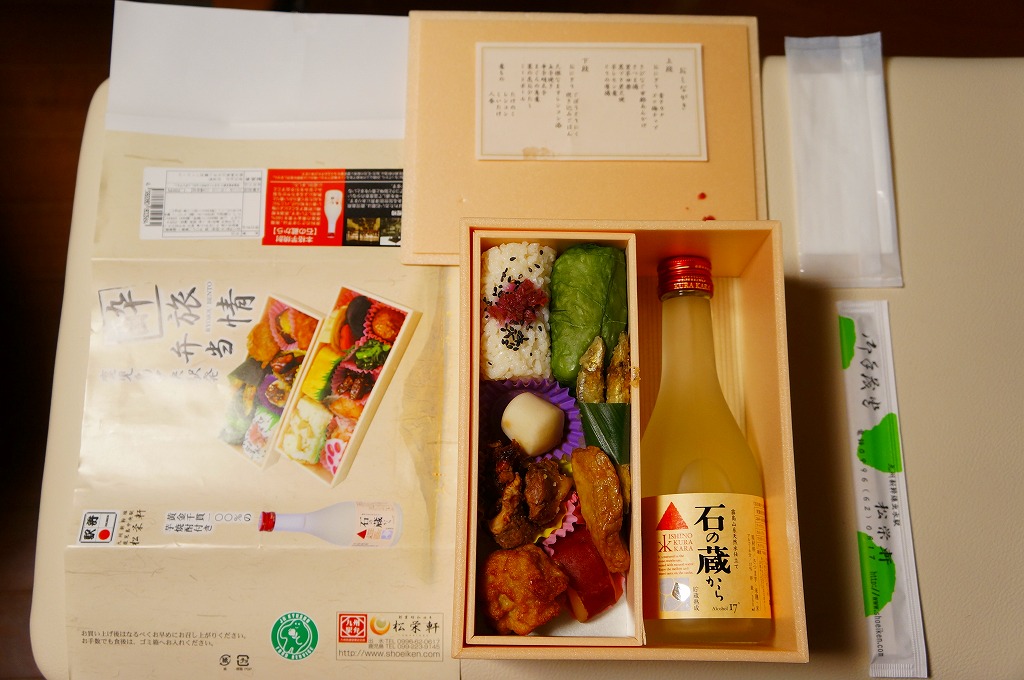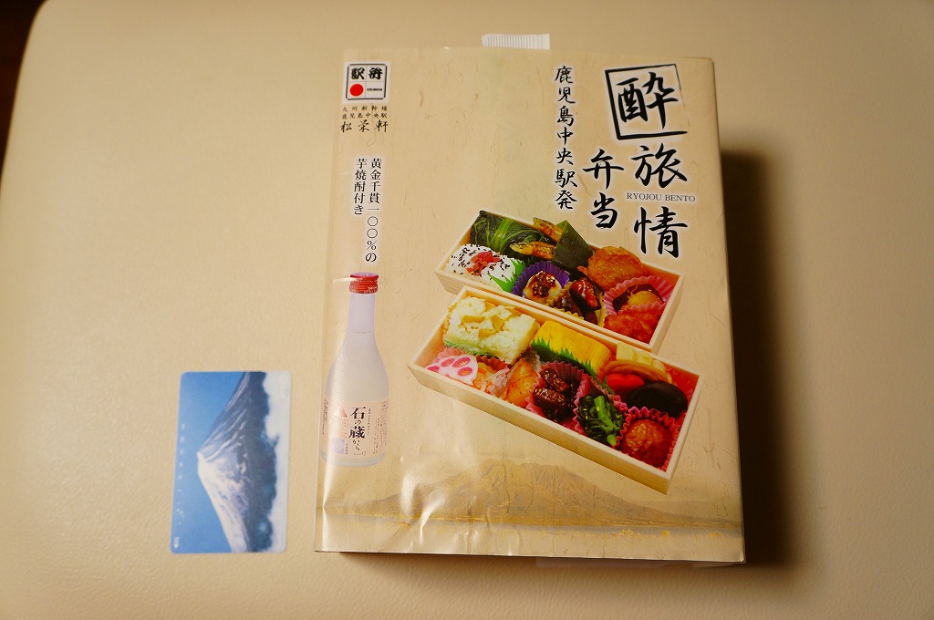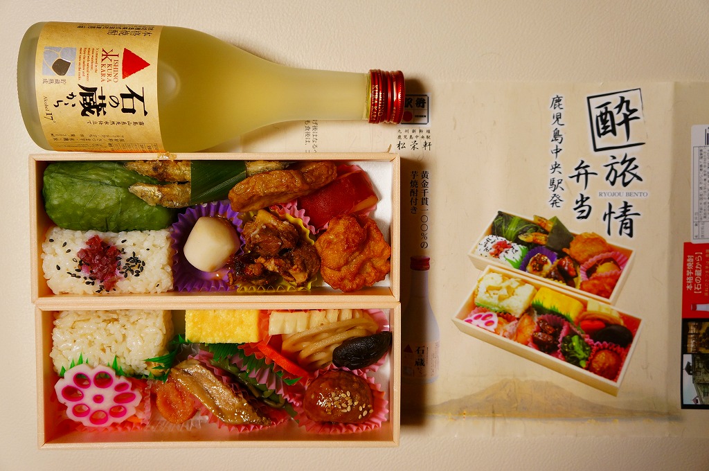 度数17度の焼酎が300ミリリットル。アルコール量では日本一の酒付き駅弁ではないかと思う。新幹線の起終点である福岡と鹿児島の味を詰めたという中身は、御飯におかずという普通の駅弁にも、酒に合わせたつまみを好んで詰めたようにも見えるし、風味もそれらを併せ持つ感じ。1年ほどで売り終えた模様。