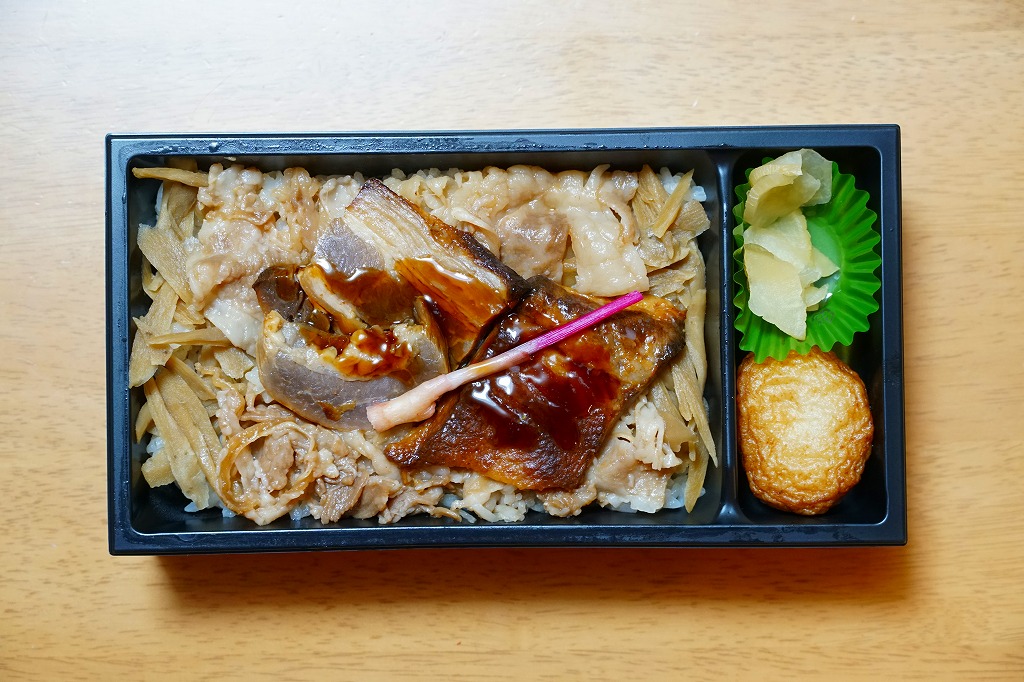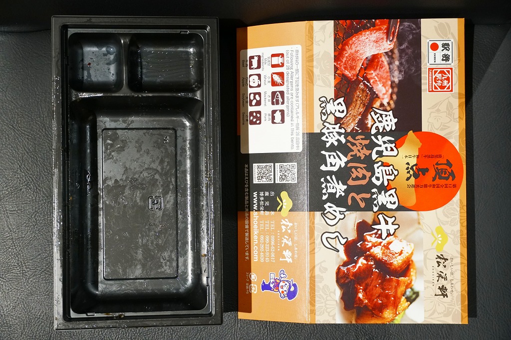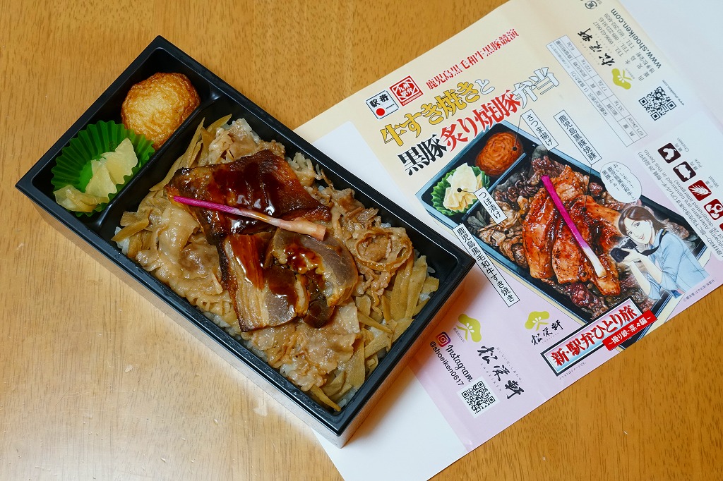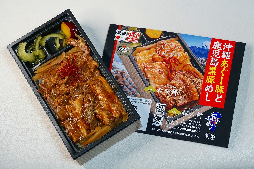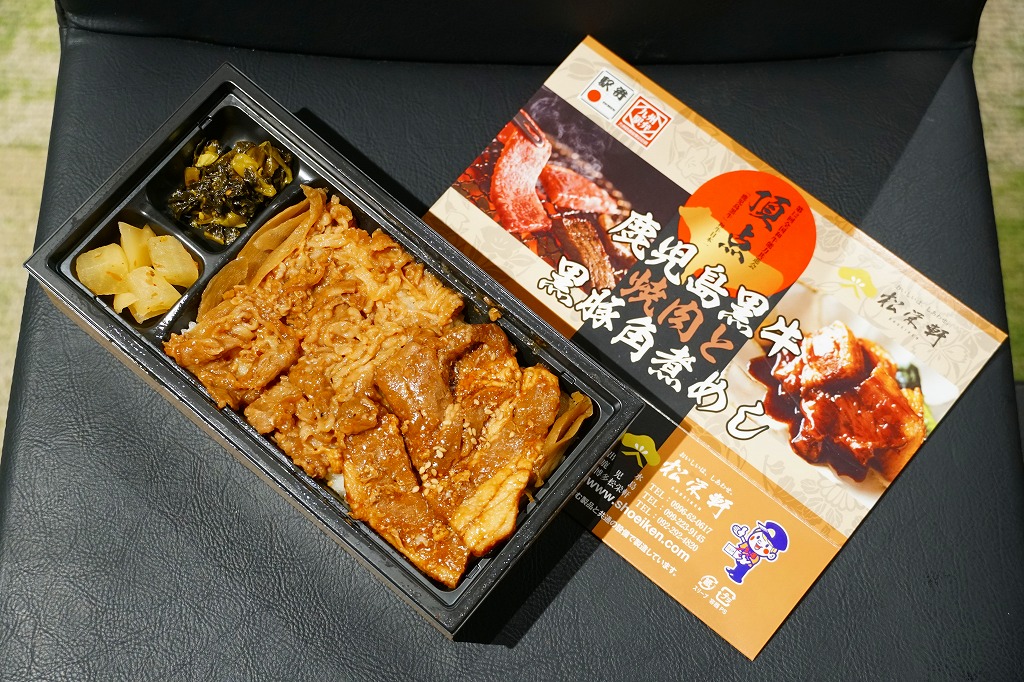秋冬の駅弁大会シーズンに向けた、2023(令和5)年秋の新商品か。長方形のプラ容器に白飯を詰め、鹿児島黒牛の焼肉と黒豚の角煮で半分ずつ覆い、きんぴらごぼうも加えて、かりんこ漬けと高菜漬けを添える。甘い味付けのお肉がたっぷり入る、肉と茶色の強いお弁当。2024年秋には名前を「牛焼肉と黒豚角煮めし」に変え、1,280円で催事向け輸送販売を継続か。