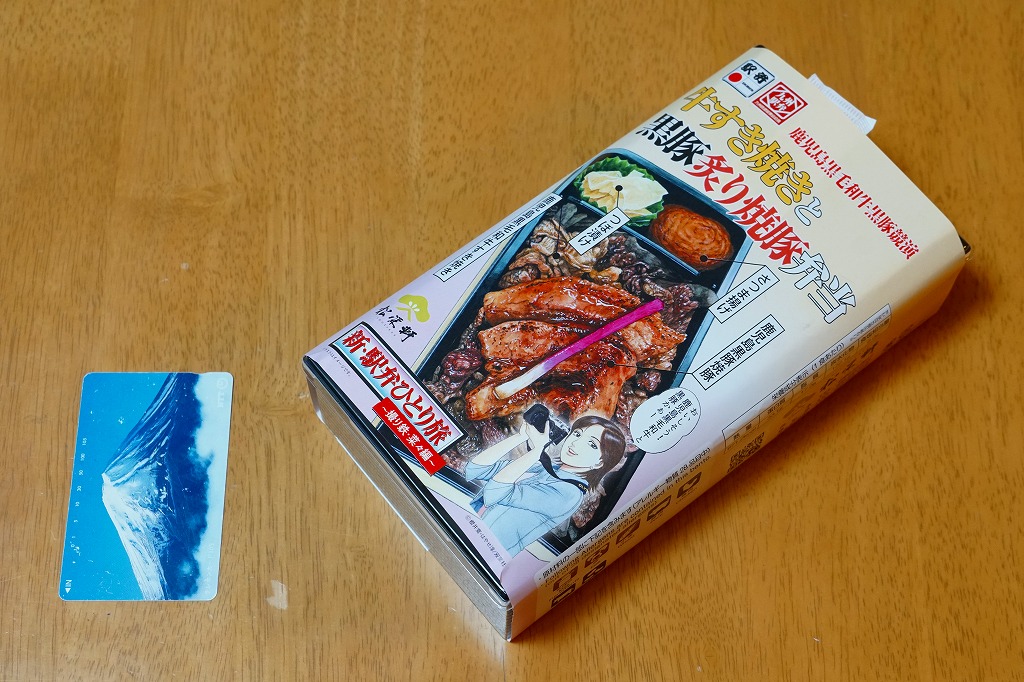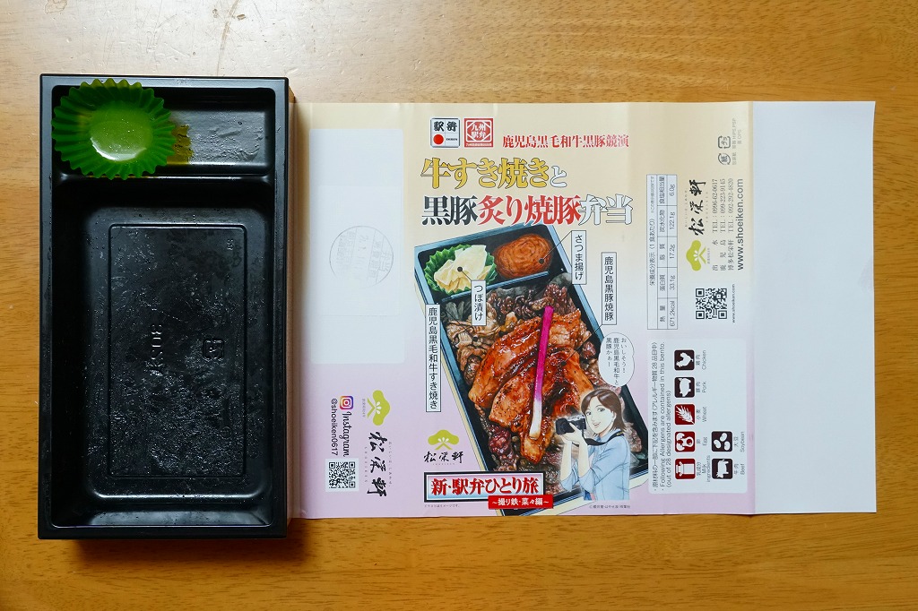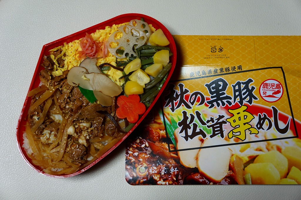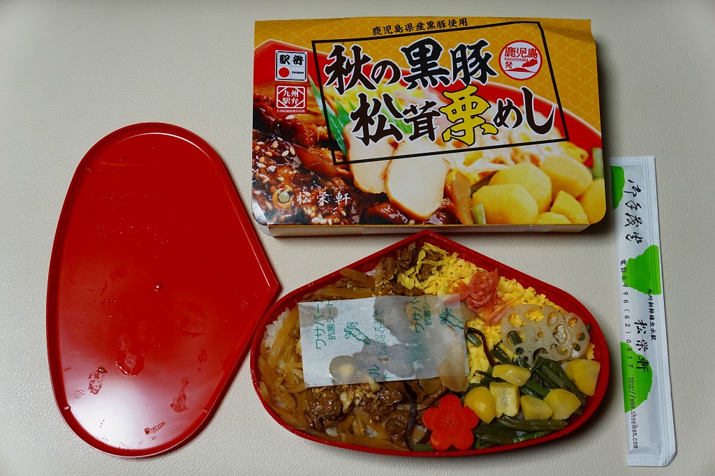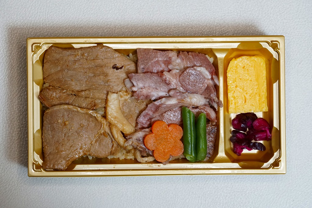 秋冬の駅弁大会シーズンに向けた、2023(令和5)年秋の新商品か。長方形のプラ容器に白飯を詰め、鹿児島黒牛の焼肉と黒豚の角煮で半分ずつ覆い、きんぴらごぼうも加えて、かりんこ漬けと高菜漬けを添える。甘い味付けのお肉がたっぷり入る、肉と茶色の強いお弁当。2024年秋には名前を「牛焼肉と黒豚角煮めし」に変え、1,280円で催事向け輸送販売を継続か。