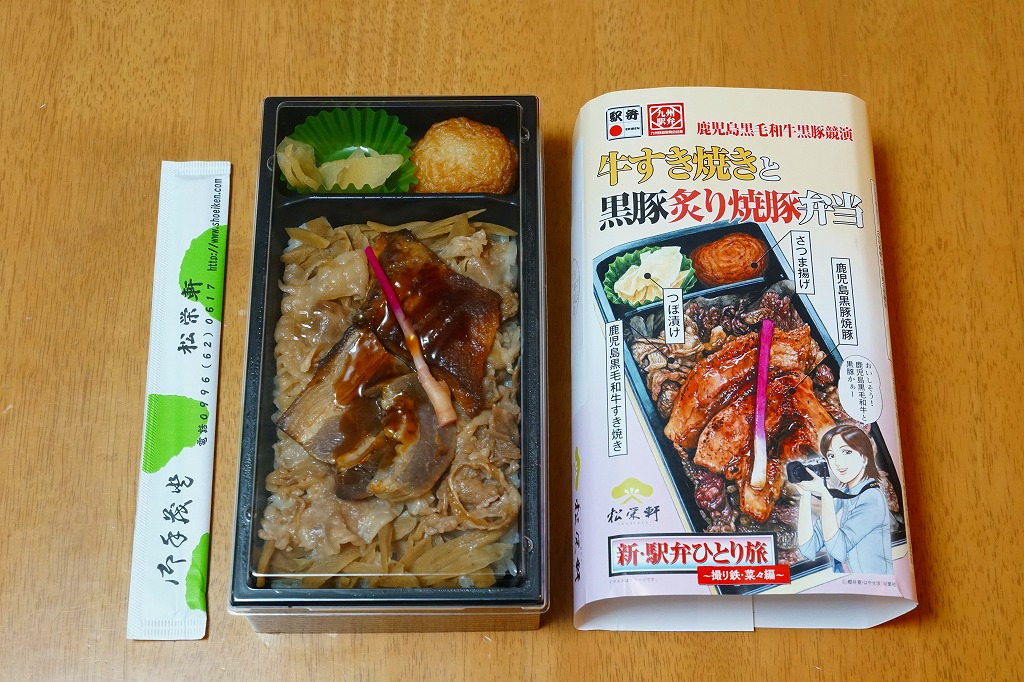 2021(令和3)年1月の京王百貨店の駅弁大会と阪神百貨店の駅弁大会で実演販売。漫画作品「新・駅弁ひとり旅」とのタイアップ商品であり、掛紙には中身のイラストとともにそのキャラクターが描かれる。中身は白飯を焼豚と牛肉煮とごぼうで覆い、はじかみで彩り、さつま揚げとつぼ漬けを添えるもの。牛も豚もアゴを鍛える噛み応え。2月には早くも、上記の駅弁「鹿児島の牛すき焼きと黒豚炙り焼豚弁当」(1,200円)へリニューアル。
