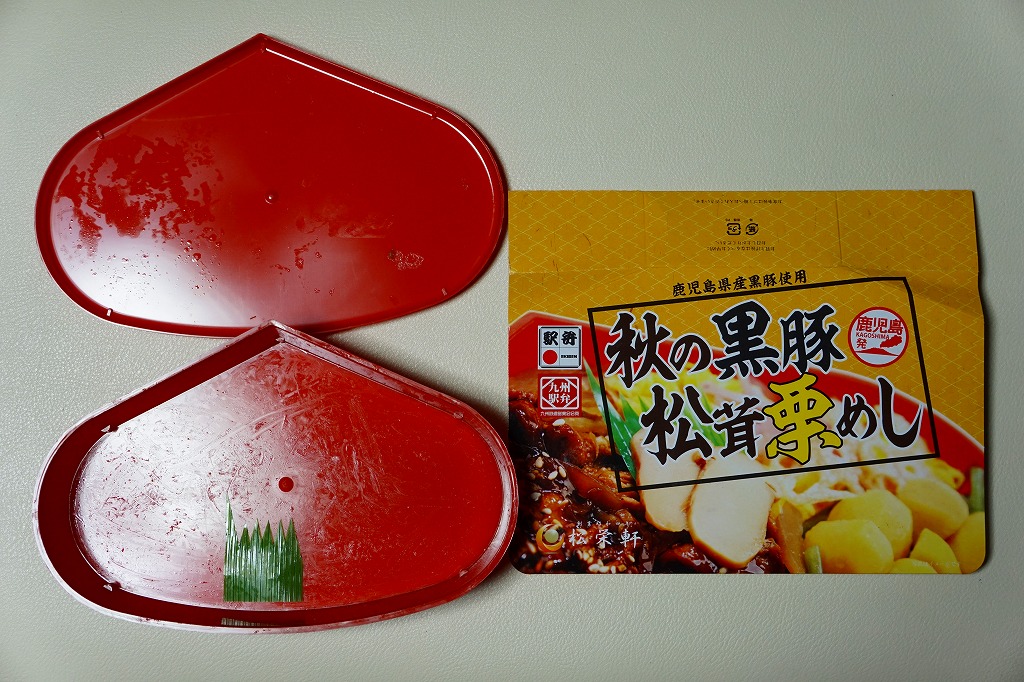 人吉駅やかつての日田駅などの駅弁でも使われる、赤い栗型のプラ製容器を、商品名や中身の写真を印刷したボール紙の枠にはめる。中身は茶飯を豚焼肉、クリ刻み、松茸スライス、錦糸卵、レンコン、ゴボウ、ぜんまいなどで覆うもの。賑やかなちらし駅弁か、黒豚・松茸・栗で3種の味が喧嘩する雑な駅弁か。価格は2015年の購入時で1,080円、2023年時点で1,150円。