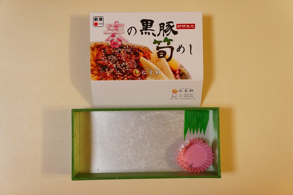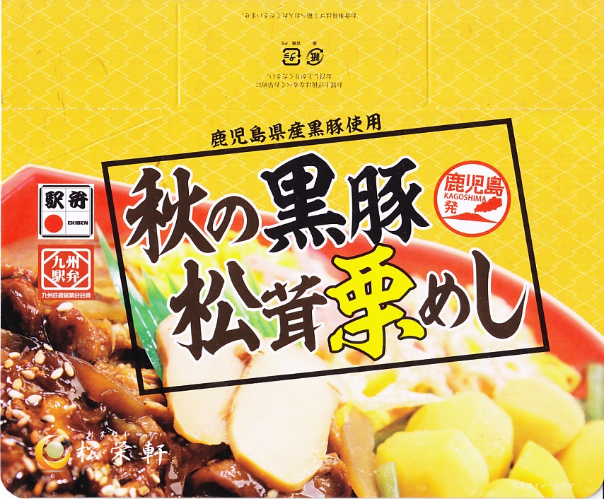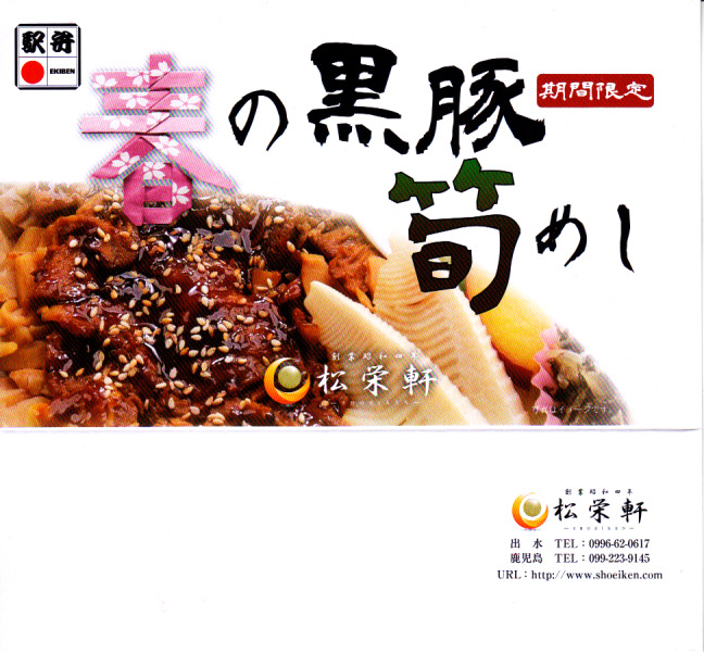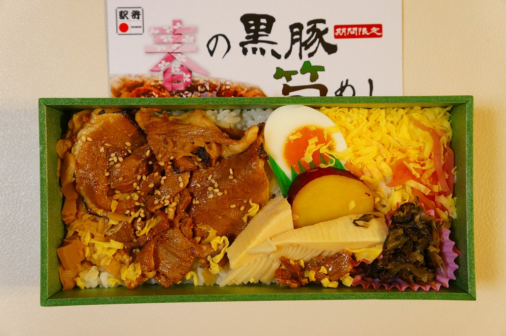 2014(平成26)年1月の発売か。抹茶色の容器に味付飯を詰め、半分を黒豚たれ焼き、半分を錦糸卵、タケノコ、煮玉子、サツマイモのレモン煮、高菜漬、紅生姜で覆う。豚肉の分量がおかずに不足するも、鹿児島をしていると思う商品。主に駅弁催事かもしれないが、1月から5月頃か、駅弁大会シーズンが終わるまでの販売。2016年に「春収穫 黒豚筍めし」へリニューアルし、容器の色を変え、ミニ大福を加えた模様。