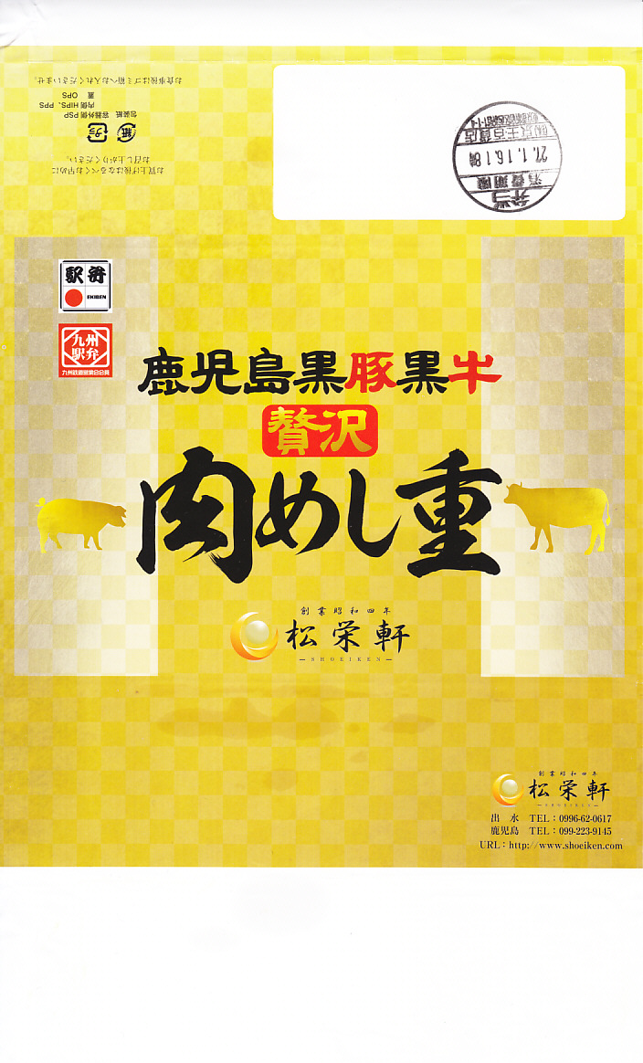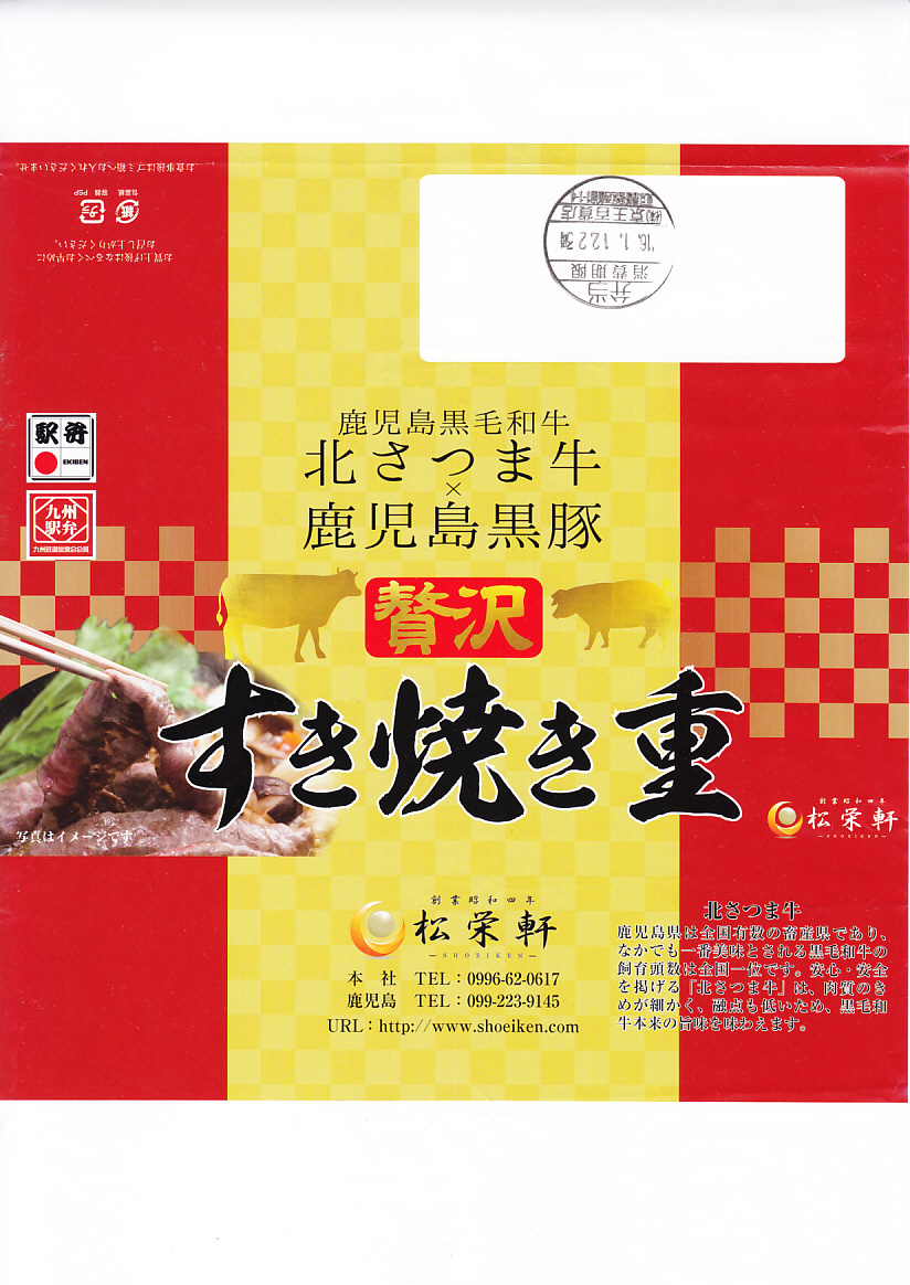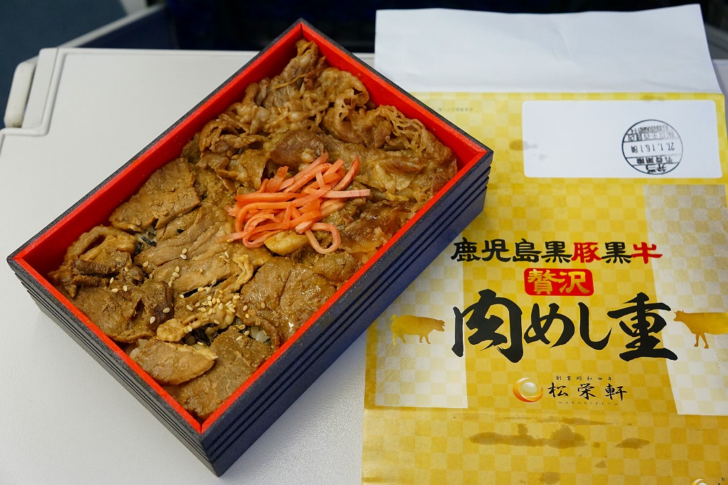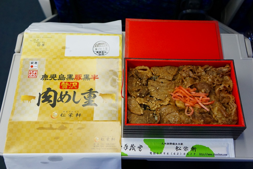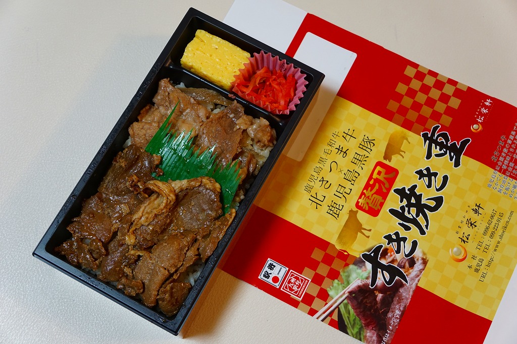 2016(平成28)年1月の京王百貨店の駅弁大会で、催事の目玉の駅弁対決の三番手として、実演販売で発売。白御飯を北さつま牛の牛肉と鹿児島黒豚の豚肉の、すき焼きというよりはむしろ焼肉で覆い、玉子焼と紅生姜を添える。他の出水駅や鹿児島中央駅の同じような駅弁と、雰囲気は特に変わらない。この駅や駅弁屋の、同じような中身と味で毎年のように新作を出してくる賑わいや意欲と、「えびめし」と違い肉の定番商品が生まれないもどかしさがある。事実上の京王百貨店駅弁大会限定販売。一応は翌月までの販売か。