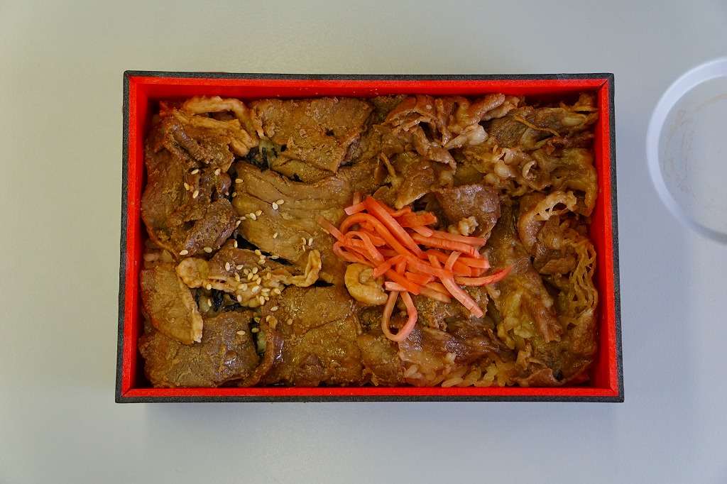 2015(平成27)年1月の京王百貨店の駅弁大会でデビュー。目玉の駅弁対決の二番手「サブ企画の肉好きのための新作肉駅弁対決」で、新神戸駅「神戸牛めし」(1,400円)と、実演販売で対決した。長方形の容器に御飯を詰め、見た目も舌でもざらざらとした豚肉と牛肉で覆い、紅生姜を載せるだけの、とてもシンプルな内容。