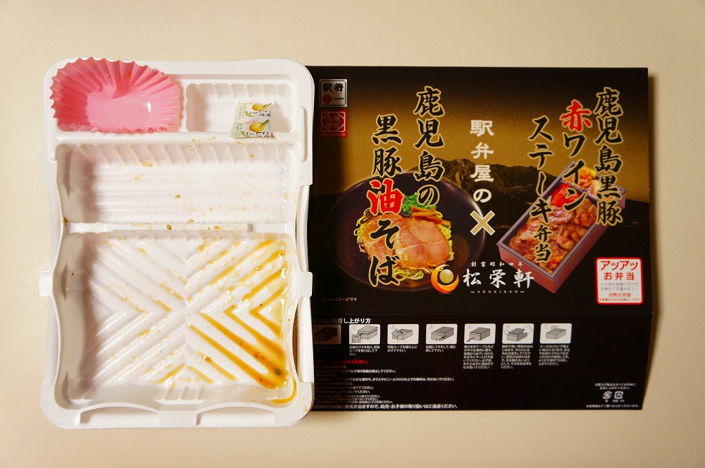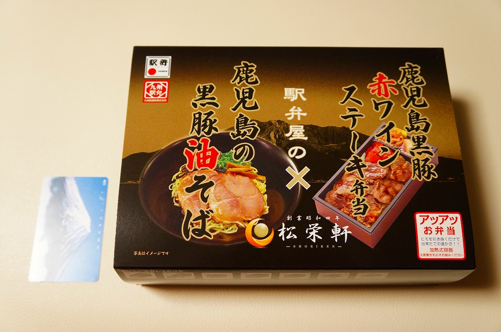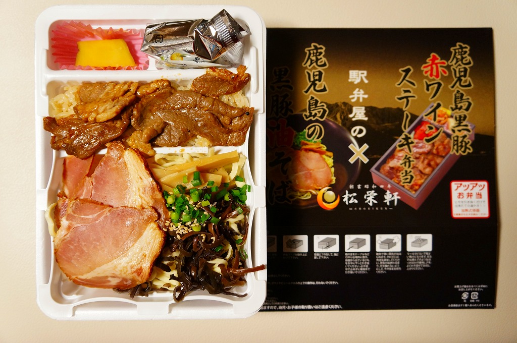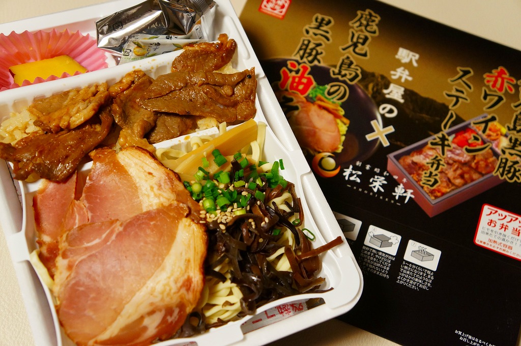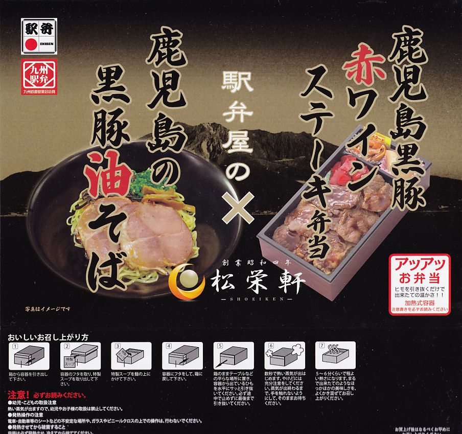 京王百貨店の駅弁大会での八戸・高松・出水の「駅麺対決」のために、2013(平成25)年1月17日の会期後半に初登場。長方形の加熱機能付き容器に、既存の鹿児島黒豚赤ワインステーキ弁当と、新開発のラーメンを詰めて、タレとサツマイモを添える。