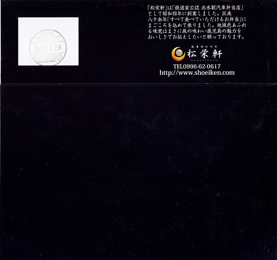 2013年秋の発売か。出水駅の駅弁を名乗り、調製元の公式ブログにもそう掲載されるが、実態は駅弁大会向け商品なのか、収穫報告は首都圏などのスーパーの駅弁大会ばかり。現地では事前に情報を得て予約しない限り見られないものではないかと思う。