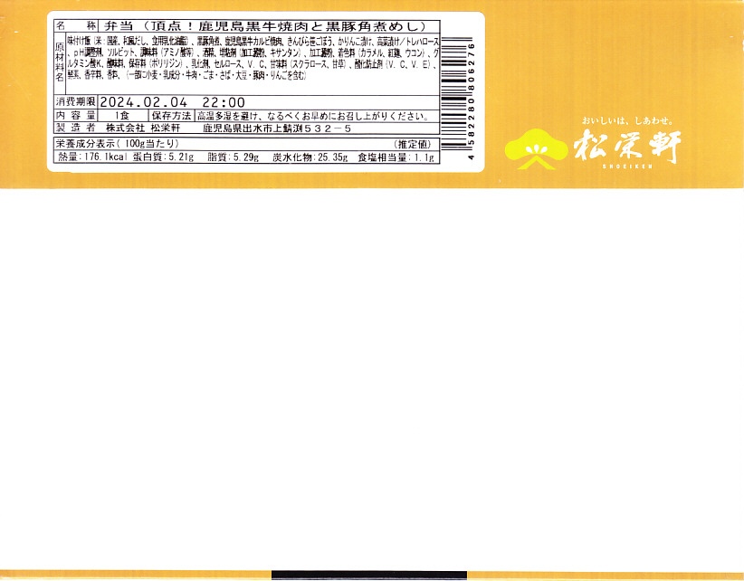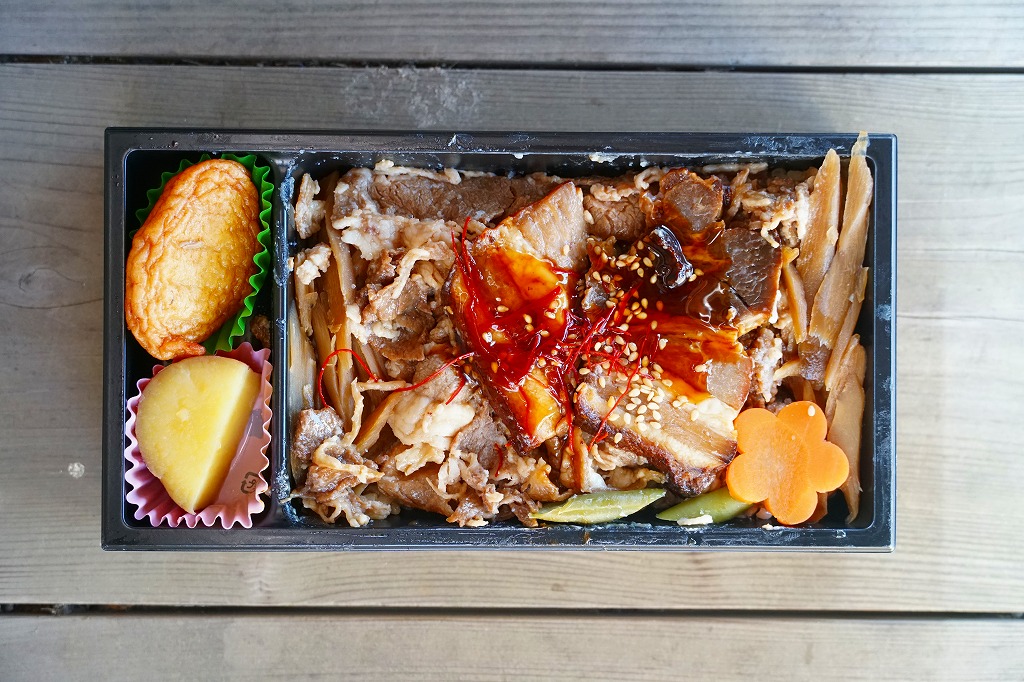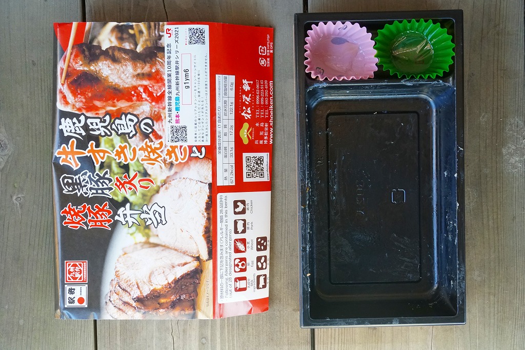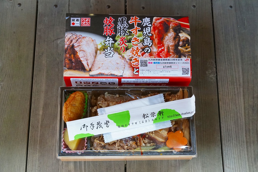 2021(令和3)年2月の発売か。3月のJR九州の駅弁キャンペーン「熊本・鹿児島 九州新幹線駅弁シリーズ2021」にエントリー。おそらく前月に京王と阪神の駅弁大会で実演販売された、下記の駅弁「鹿児島黒毛和牛黒豚競演牛すき焼きと黒豚炙り焼豚弁当」の、漫画作品「新・駅弁ひとり旅」タイアップを外し、掛紙を替えて名前を変えて、値段を300円も下げたものだろう。白飯を焼豚と牛肉煮とごぼうで覆い、花人参といんげんで彩り、さつま揚げとサツマイモを添える内容と、肉の固さはほとんど同じ。約1年で終売か。