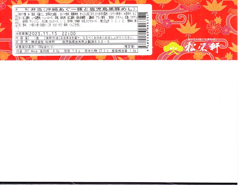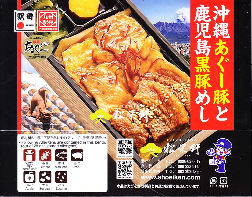 秋冬の駅弁大会シーズンに向けた、2023(令和5)年秋の新商品として、9月に全国各地のスーパーで発売か。長方形のプラ容器に御飯を詰め、沖縄あぐー豚の焼肉と鹿児島黒豚の角煮を載せ、ごぼうも詰めて糸唐辛子で彩り、ゴーヤーの酢漬けとサツマイモの甘露煮を添える。お肉がいったいどちらのものか分からなくても、内容を見れば沖縄と鹿児島の詰合せ。スリーブに少しだけ見える写真も、鹿児島の桜島と沖縄の住宅の屋根とシーサーを並べた。駅弁大会シーズンの半年間ほどの販売か。