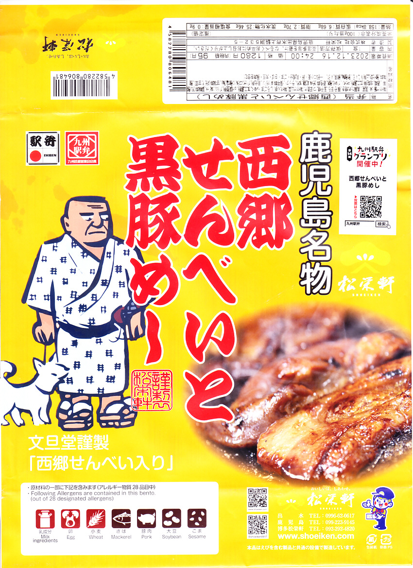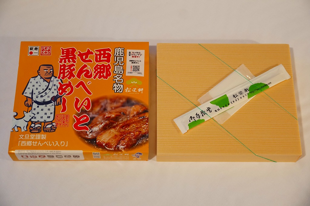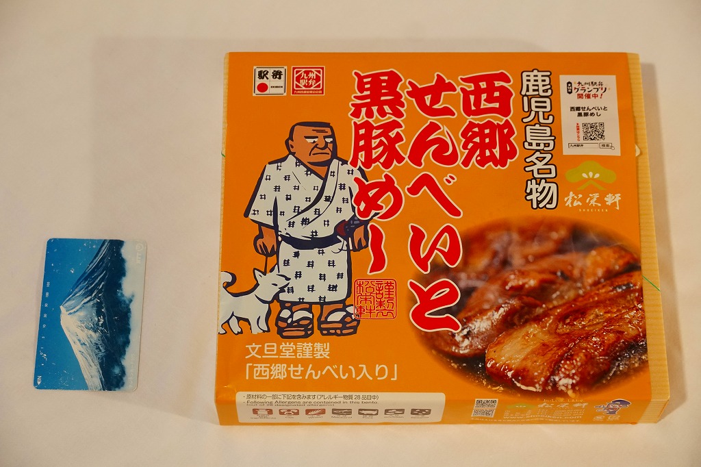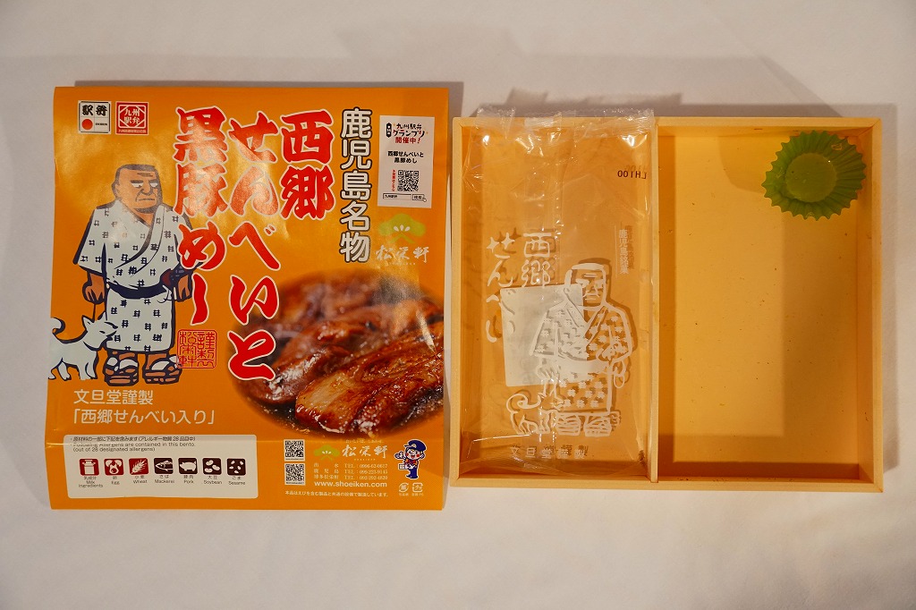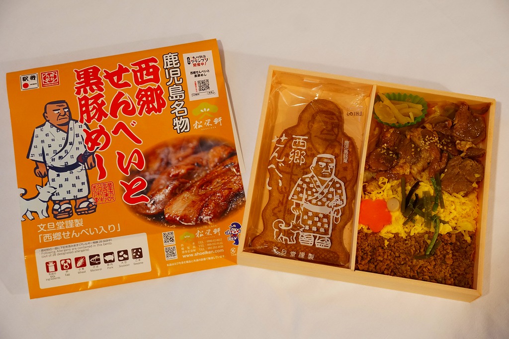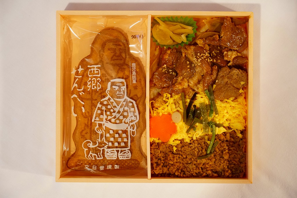 2023(令和5)年10月に出水駅と鹿児島中央駅で発売、同月からのJR九州の駅弁キャンペーン「第14回九州駅弁グランプリ」にエントリー。犬を連れた西郷隆盛のイラストと中身のイメージ写真を使う黄色い掛紙に包まれた、平たい長方形の容器のふたを開けると、半分弱の区画に西郷隆盛の全身像の煎餅が置かれ、残りの区画に黒豚たれ焼きと豚そぼろと錦糸卵などで覆われる茶飯を配置。これは煎餅が本体で豚飯がおまけなのか、その逆なのか、弁当としての容器の使い方がおかしくて、記憶に残る。駅弁大会シーズンの半年間ほどの販売か。