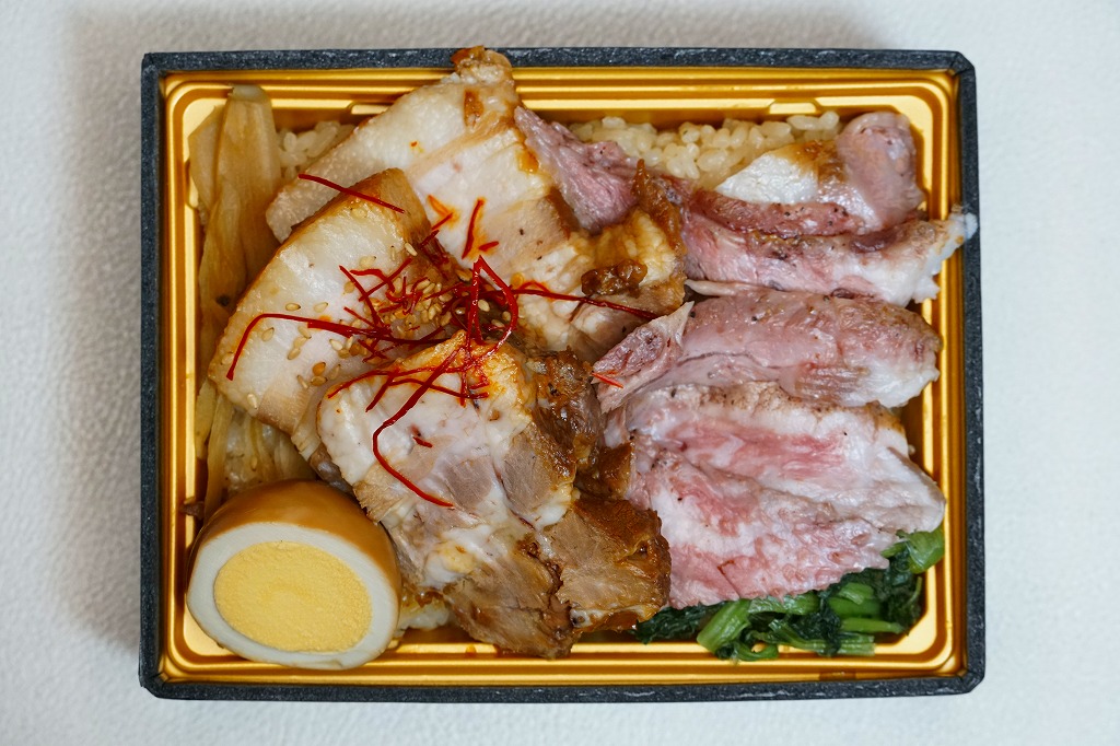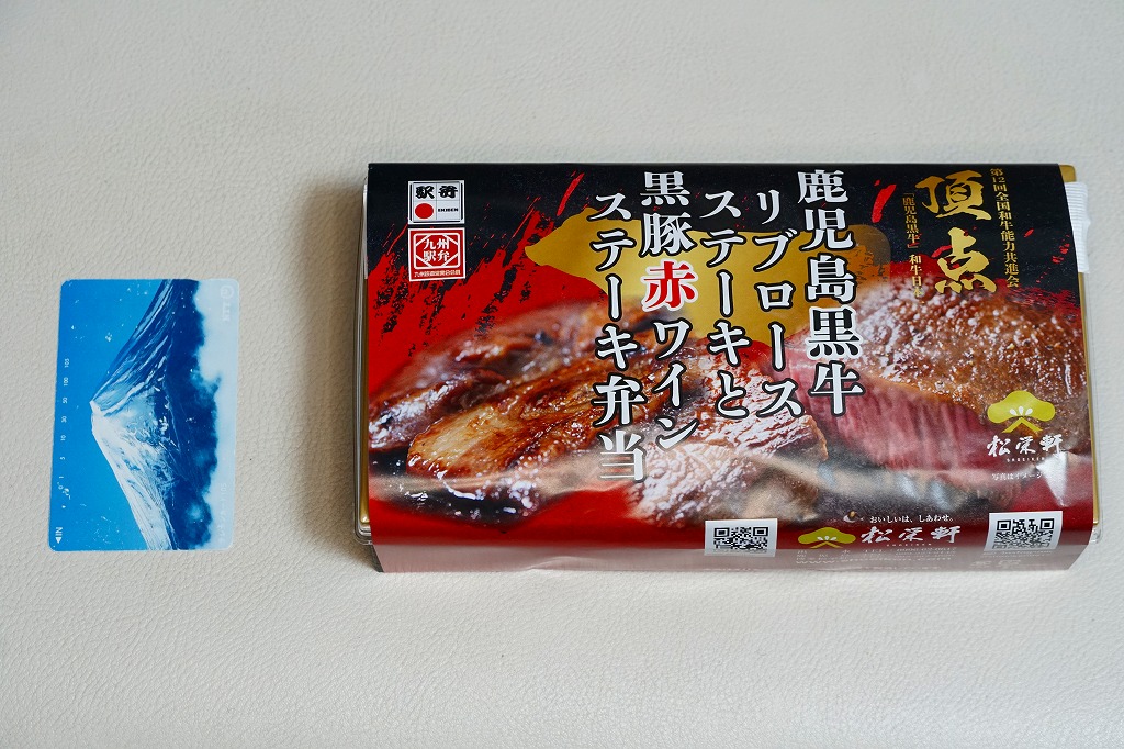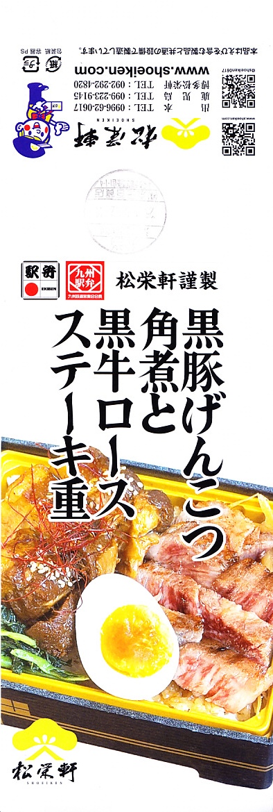 2025(令和7)年1月の京王百貨店の駅弁大会で実演販売。透明なふたを上げて盛る催事向けのプラ容器に茶飯を敷き、黒豚げんこつ角煮と黒牛ロースステーキを盛り、煮玉子とささがきごぼうと高菜炒めを添えた。掛紙の写真でも現物でも、牛や豚の脂身がおいしそうに浮き出て、食べても柔らかく、値段に追い着く肉の味。今後に催事場での実演販売でない場所へ出てくるかどうか。そういえば駅弁の名前に「鹿児島」が付いていない。