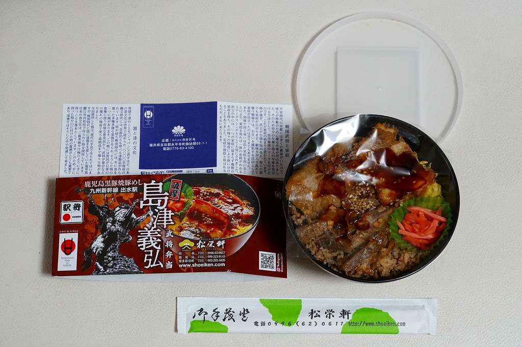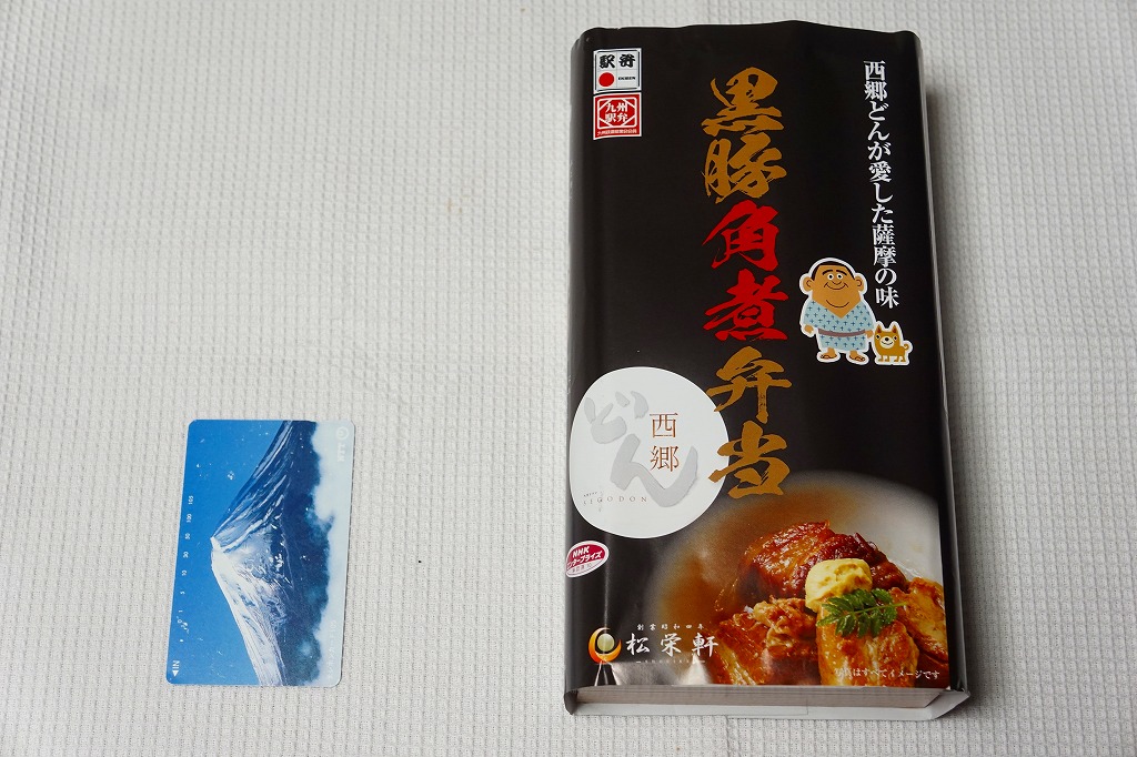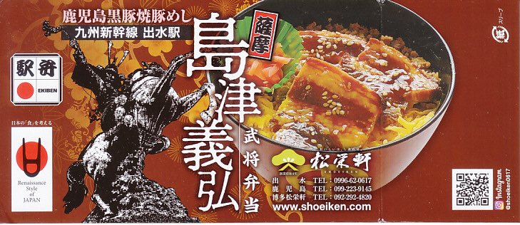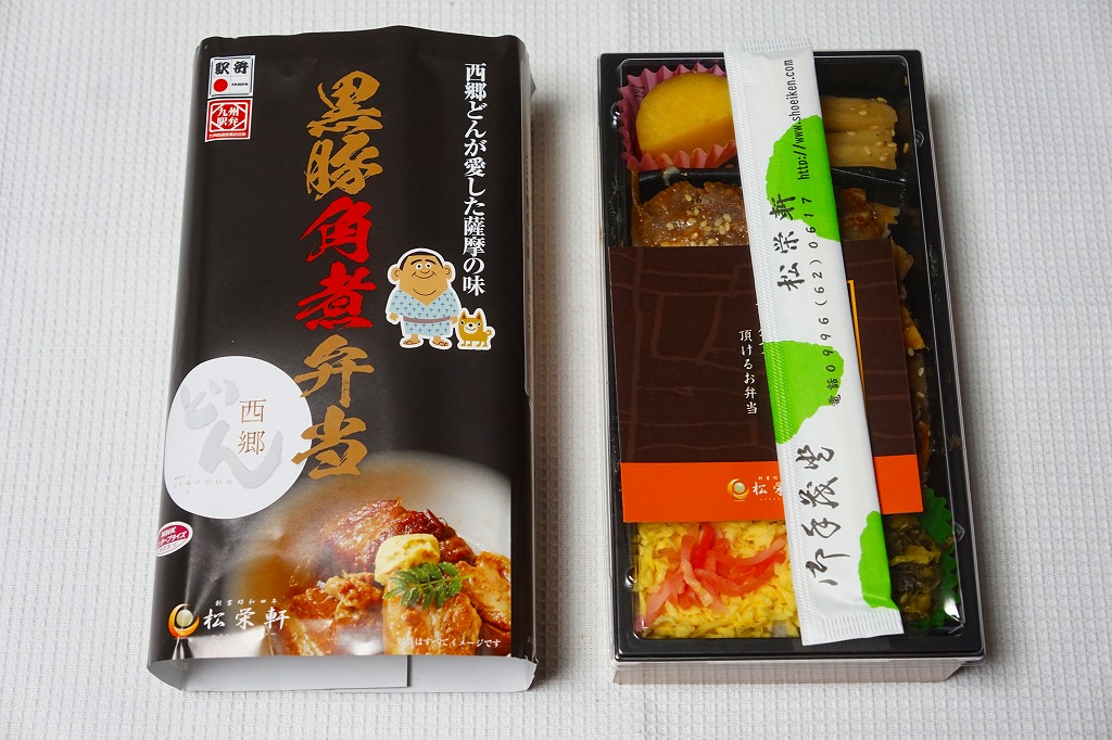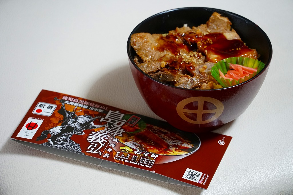 2017(平成29)年1月か、それ以前の発売か。真っ黒でシンプルなデザインの掛紙には、2018(平成30)年のNHK大河ドラマ「西郷どん」に関する絵柄や承認済シールがあった。中身は白御飯を黒豚角煮4枚と錦糸卵と高菜で覆い、ゴボウとサツマイモと紅生姜を添えるもの。見た目どおりの強い味。東京駅でも輸送販売される。2018年までの販売か。