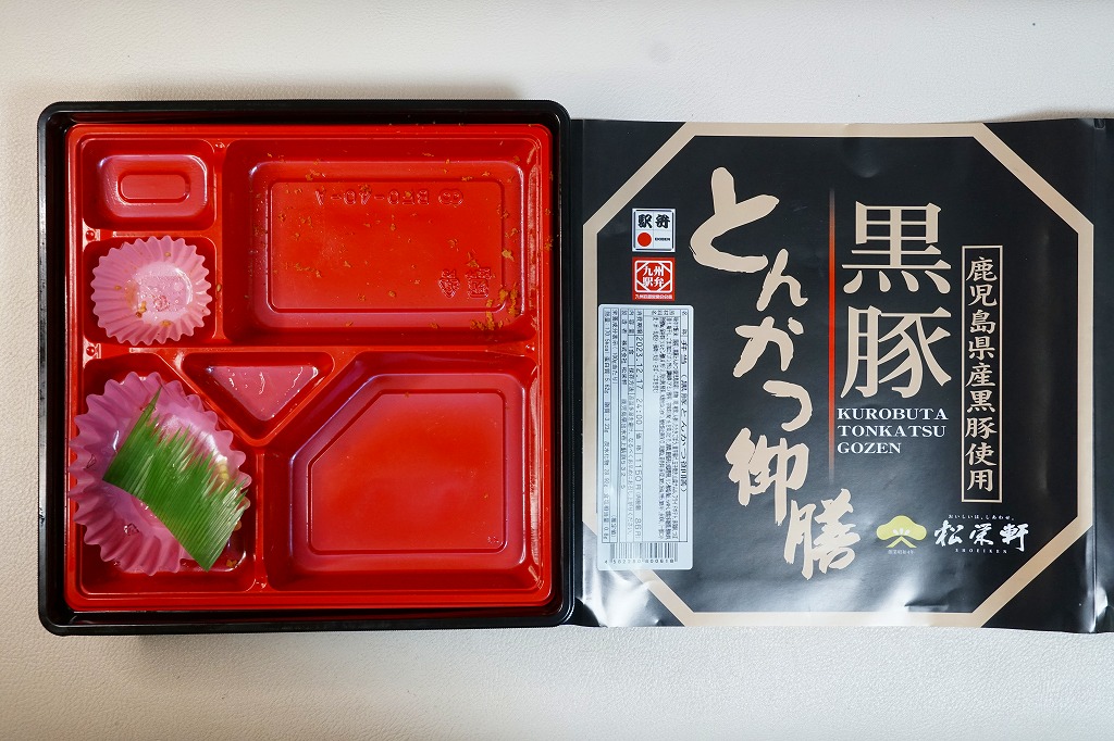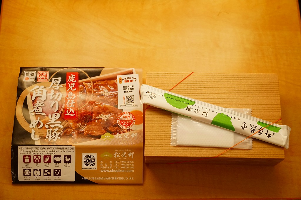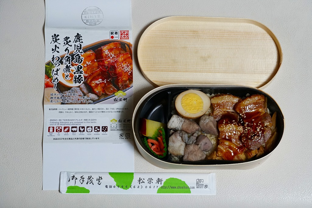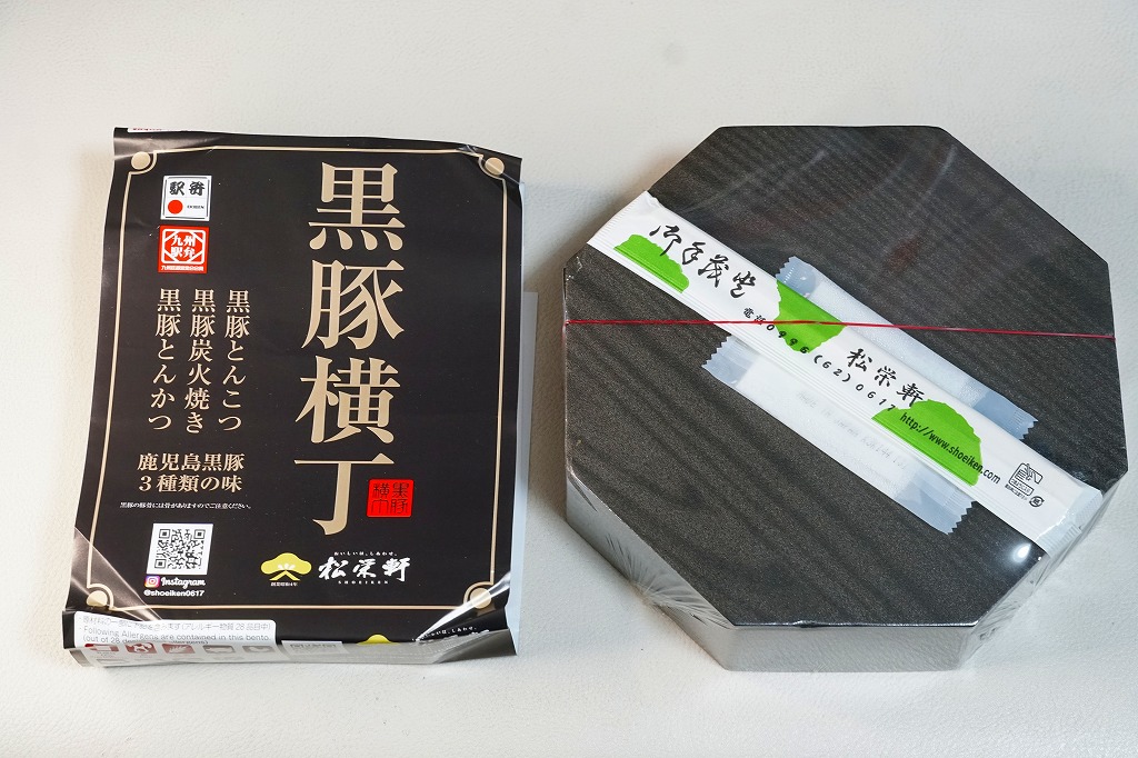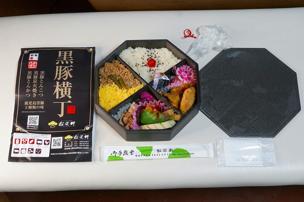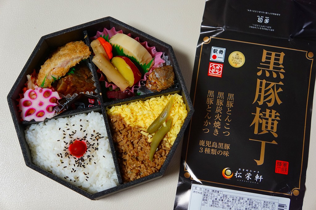 真っ黒な正八角形の容器を4区画に仕切り、日の丸御飯、茶飯を豚そぼろと錦糸卵で覆うもの、黒豚のとんこつと炭火焼とトンカツ、煮物や酢の物やサツマイモなどを詰める。豚の料理や駅弁は各地に出ても、とんこつは鹿児島特有なので、もっとご当地駅弁に入れてほしいもの。値段は2016年時点で1,080円、2019年10月から1,150円、2023年時点で1,200円。2024年までの販売か。