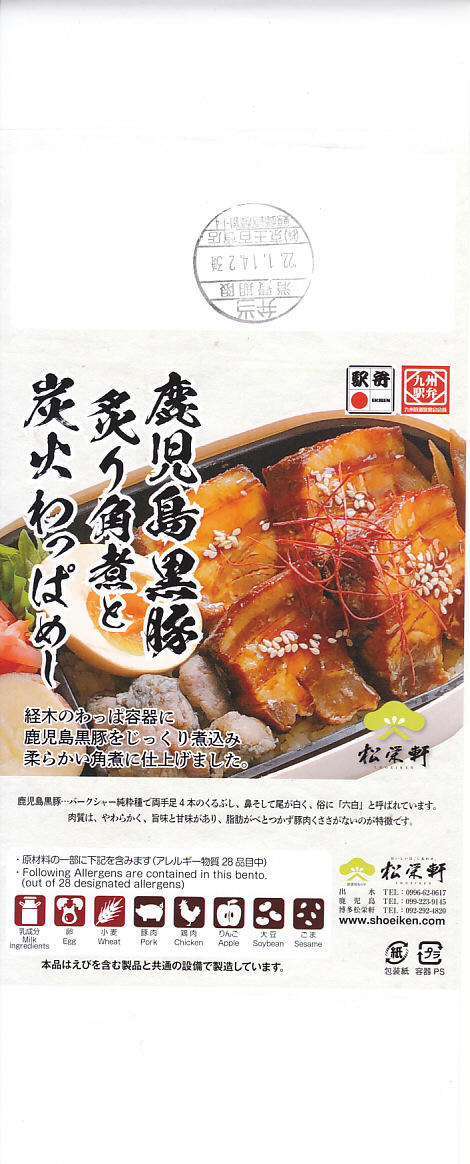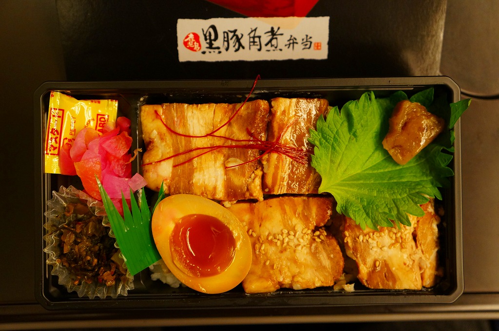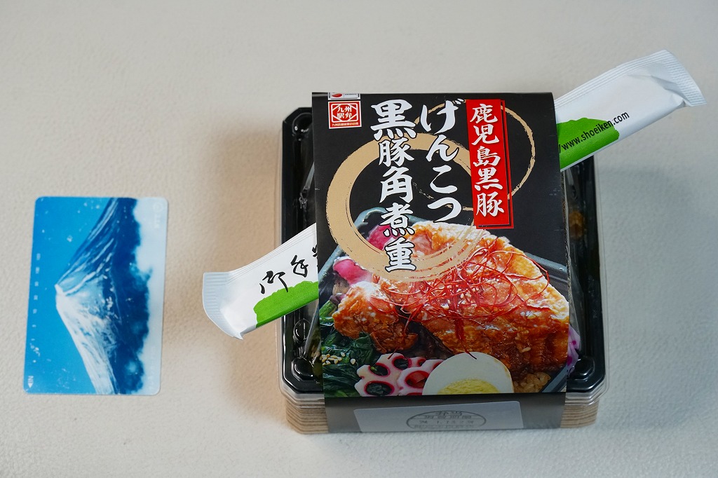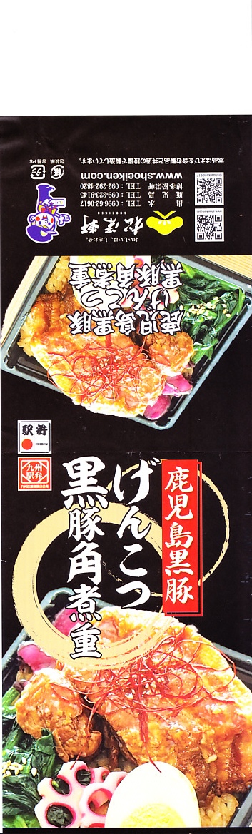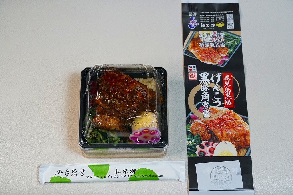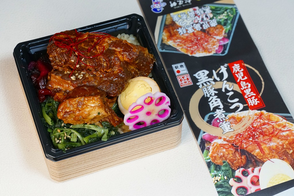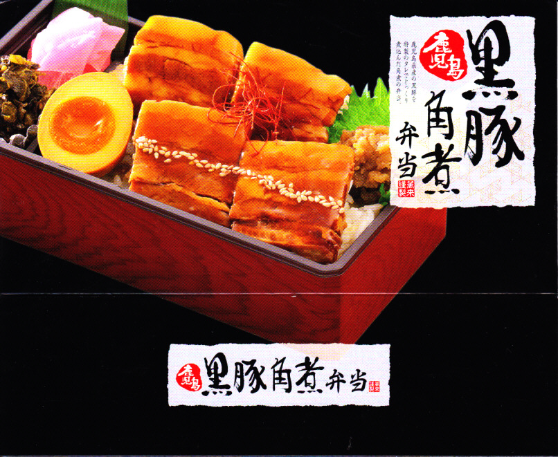 2024(令和6)年1月の京王百貨店の駅弁大会で実演販売。2月の阪神百貨店の駅弁大会でも実演販売。見栄え重視の惣菜容器に茶飯を詰め、「鹿児島黒豚げんこつ黒豚角煮」とする肉塊をどんと置き、煮玉子、花れんこん、菜の花、柴漬けを添える。催事場での注目と集客は控えめに見えたが、豪快なのに柔らかく食べやすい豚角煮は、鹿児島中央駅にあふれる黒豚駅弁のどれよりも、視覚と味覚に訴えてくると思う。人気投票にかければ高得点を期待できそう。3月まではスーパーの駅弁催事などで販売か。