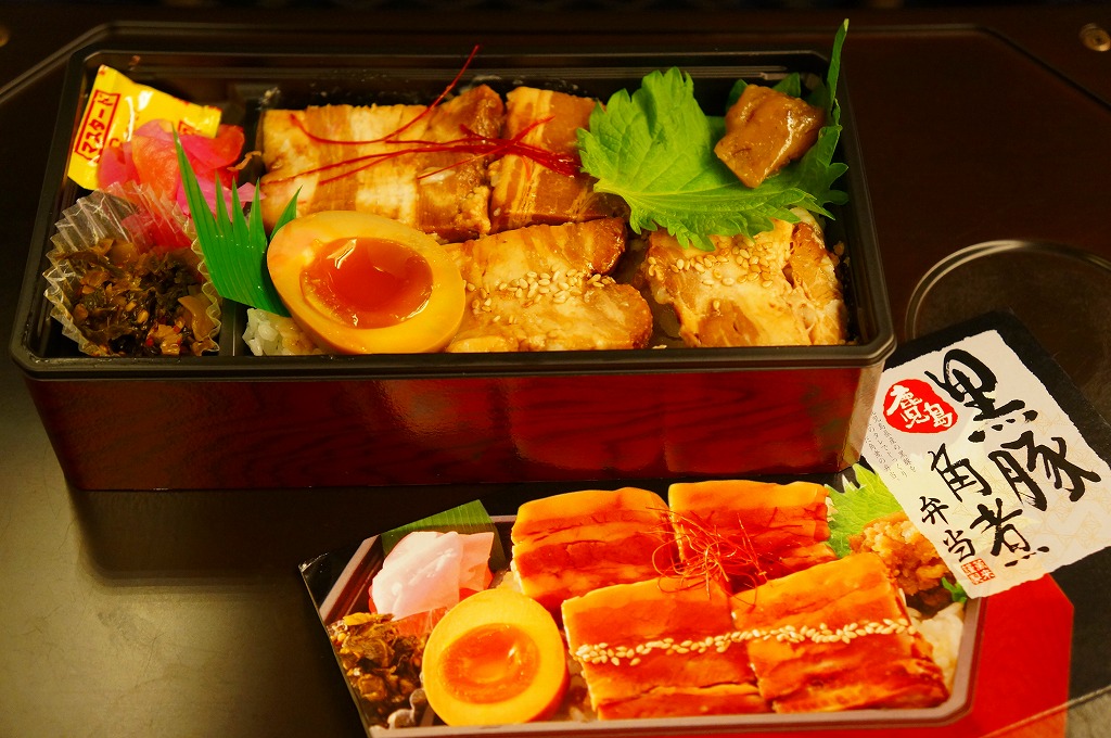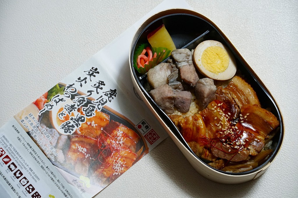 百貨店催事に空弁に道弁にネット通販にと活躍する豚角煮弁当が、2011(平成23)年までに鹿児島中央駅にも進出。白御飯の上を、形がきれいでおいしそうで分厚い豚角煮で覆い、半熟卵と豚味噌を添え、高菜炒めと大根桜漬とマスタードを付ける。豚角煮と煮玉子はコテコテでトロトロで、豚味噌はお湯で溶けばとんこつラーメンの汁になりそうな、御飯を濃厚にいただく駅弁。これは駅弁大会に向きそう。価格は2013年の購入時で1,050円、2014年4月の消費税率改定で1,080円。2020年はこれが志布志駅の駅弁として、大手スーパーの駅弁大会で売られたらしい。